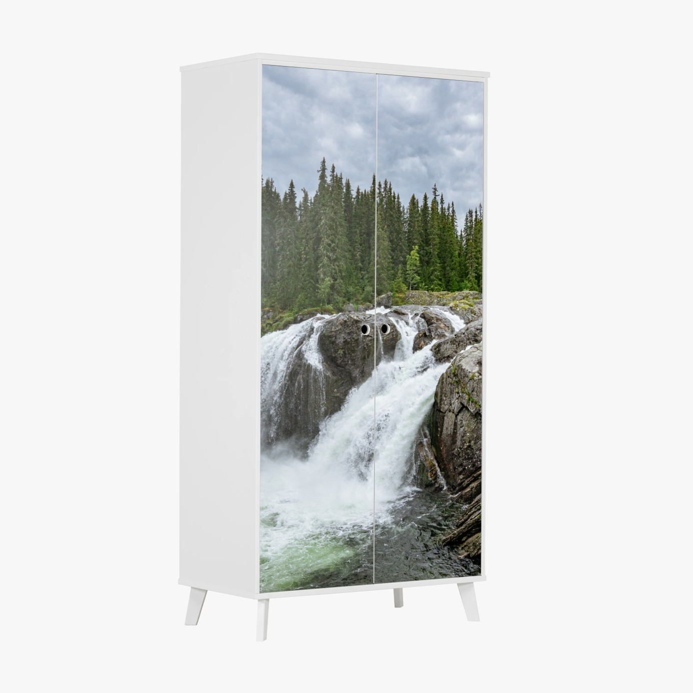 Naklejka na szafę Mglisty wodospad w bujnym sosnowym lesie