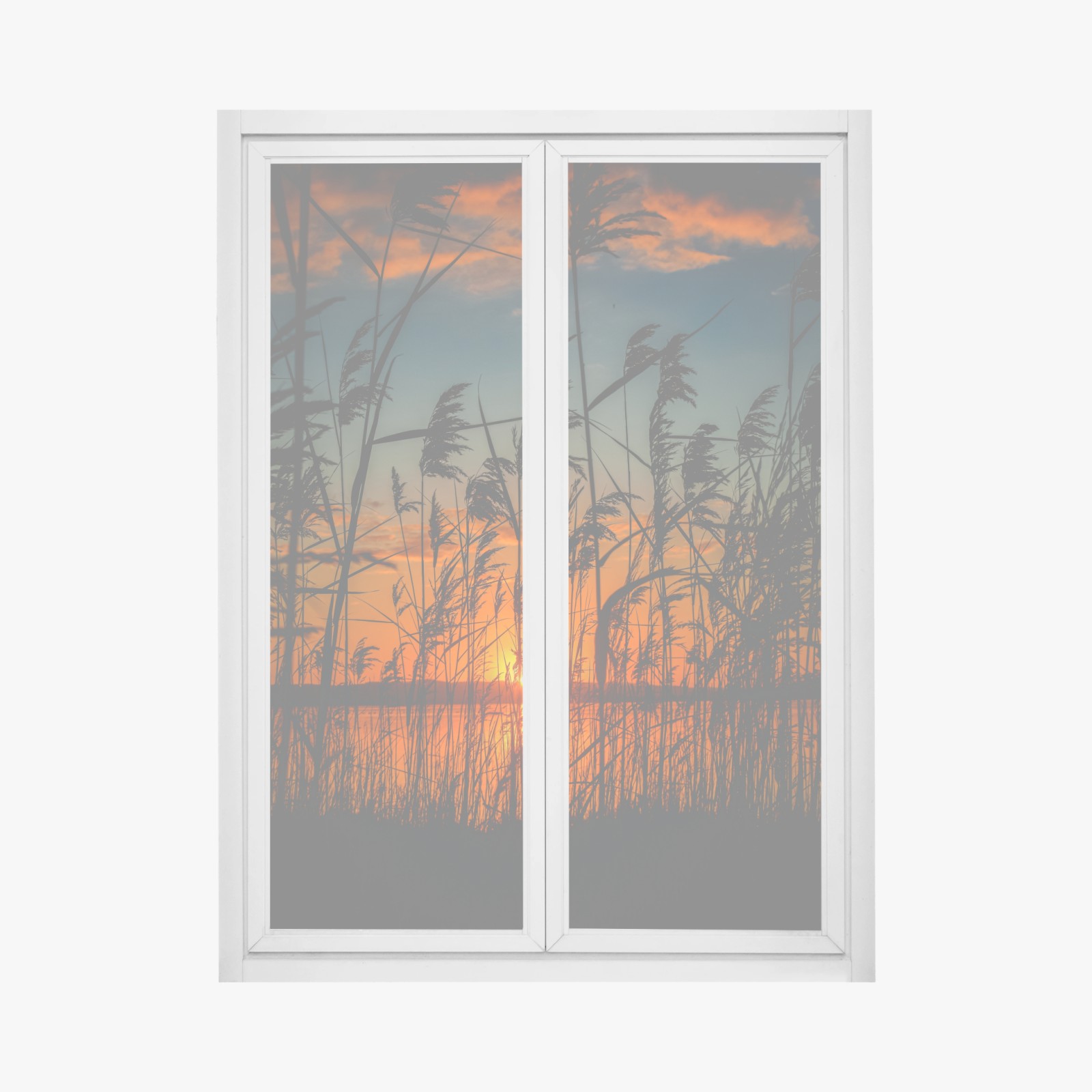 Naklejka na okno Zachód słońca nad jeziorem z sitowiem w sylwecie