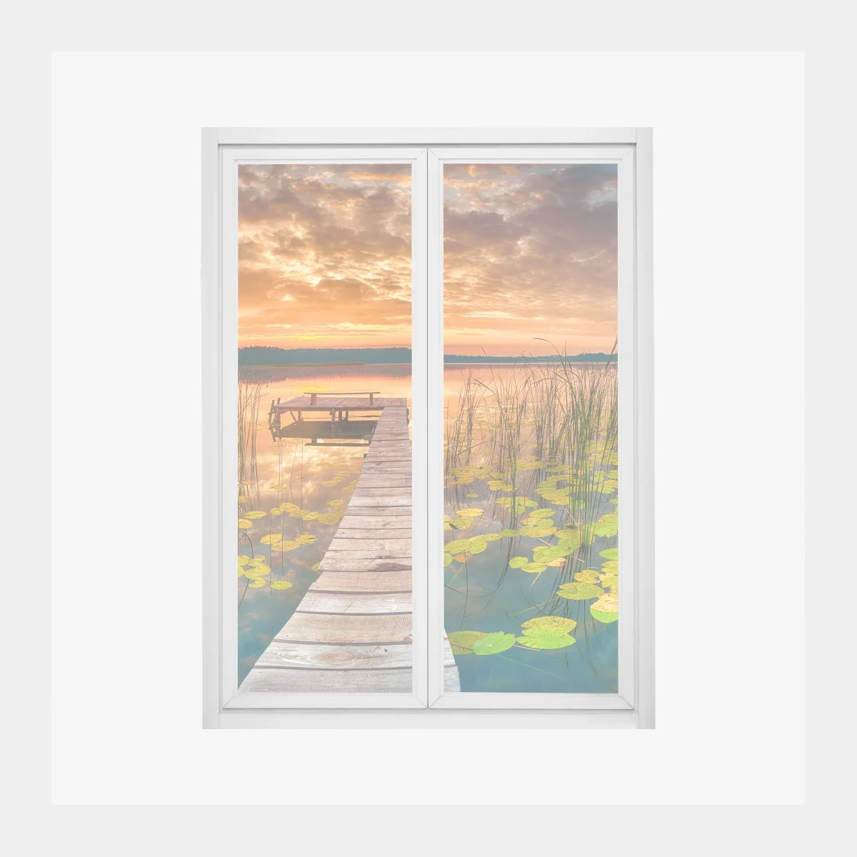 Naklejka na okno Wschód słońca nad spokojnym jeziorem z drewnianym pomostem