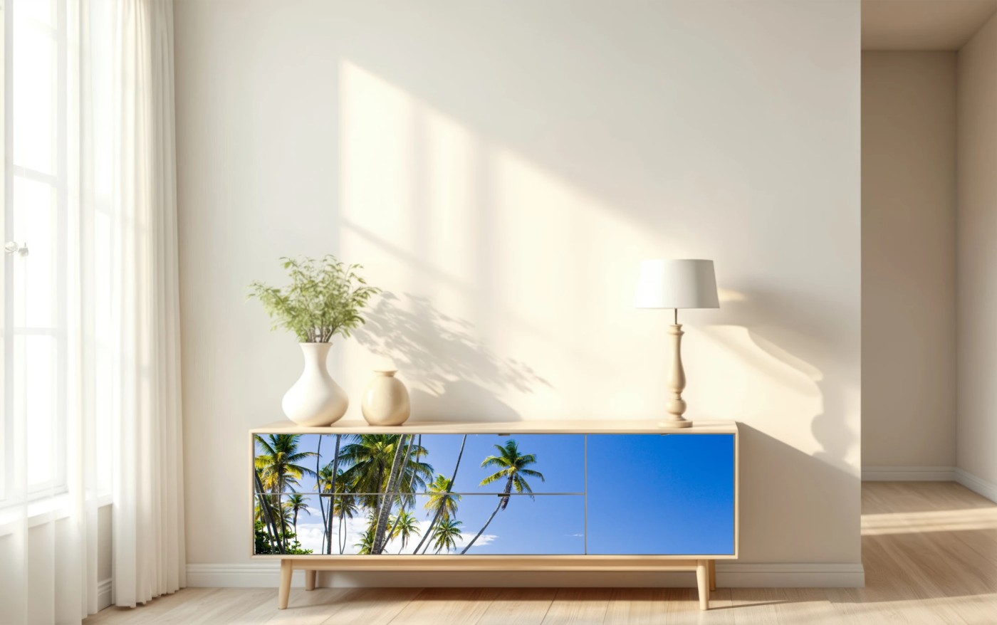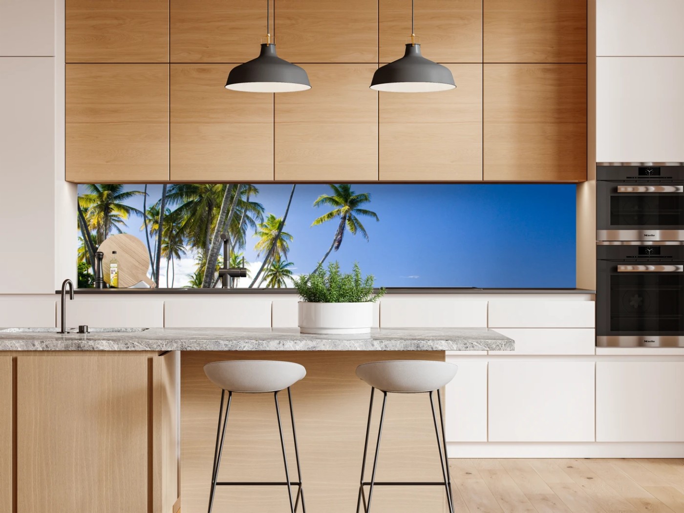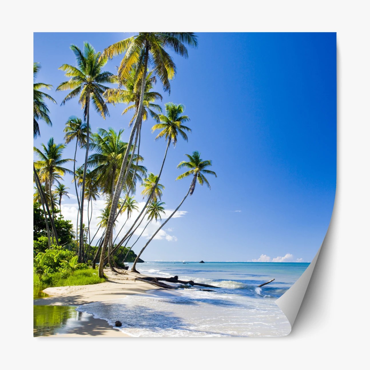 Naklejka repozycjonowalna Tropikalna plaża z palmami pod błękitnym niebem