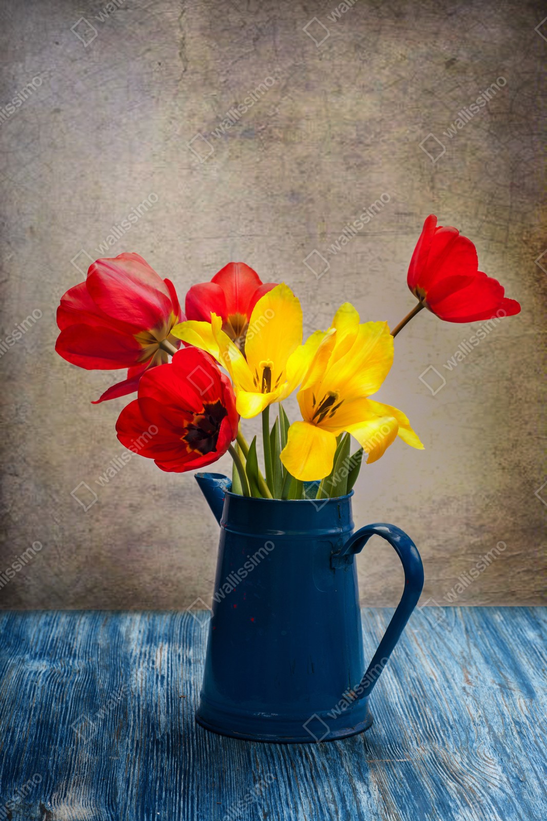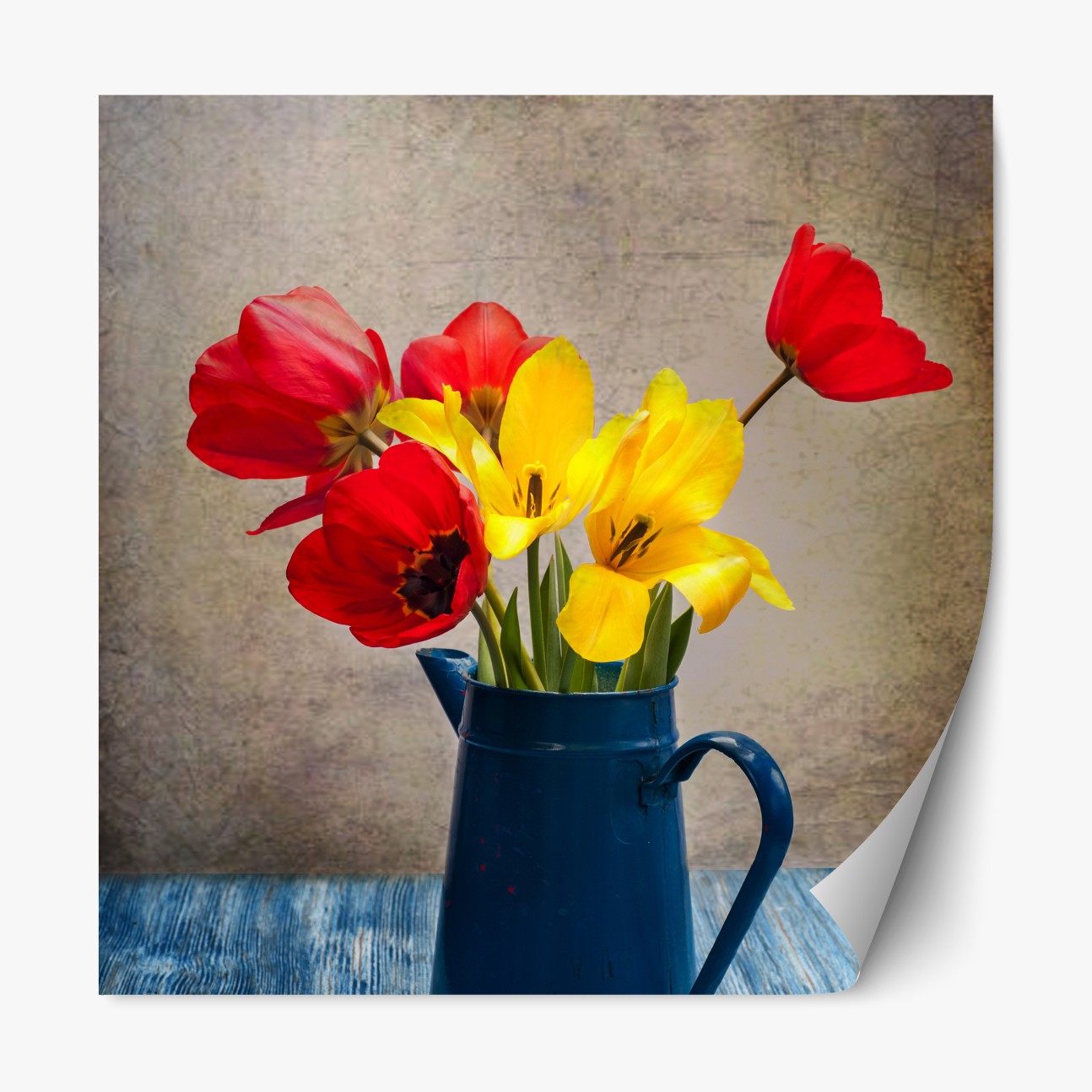 Naklejka repozycjonowalna Kolorowy bukiet tulipanów w niebieskim dzbanku