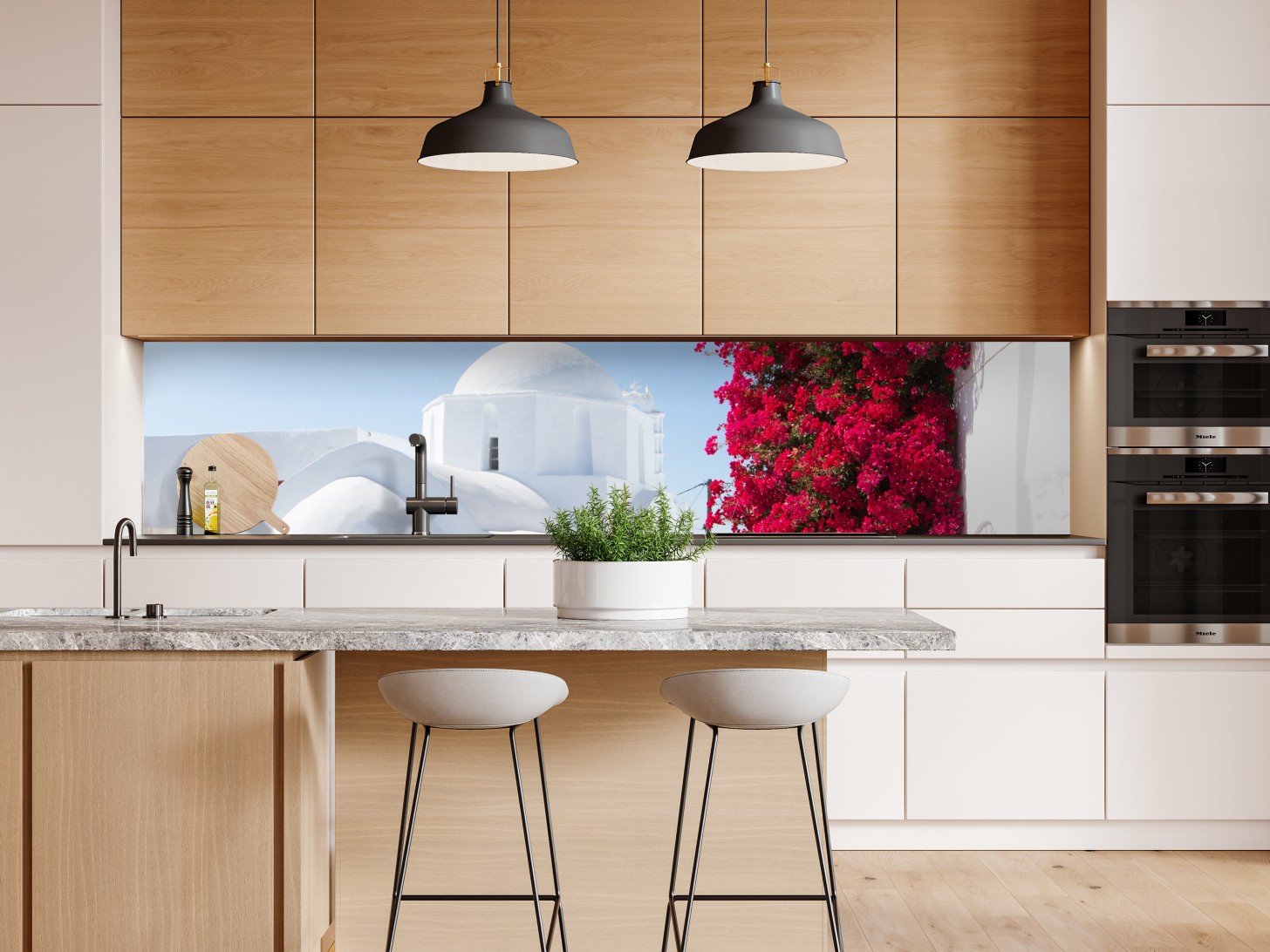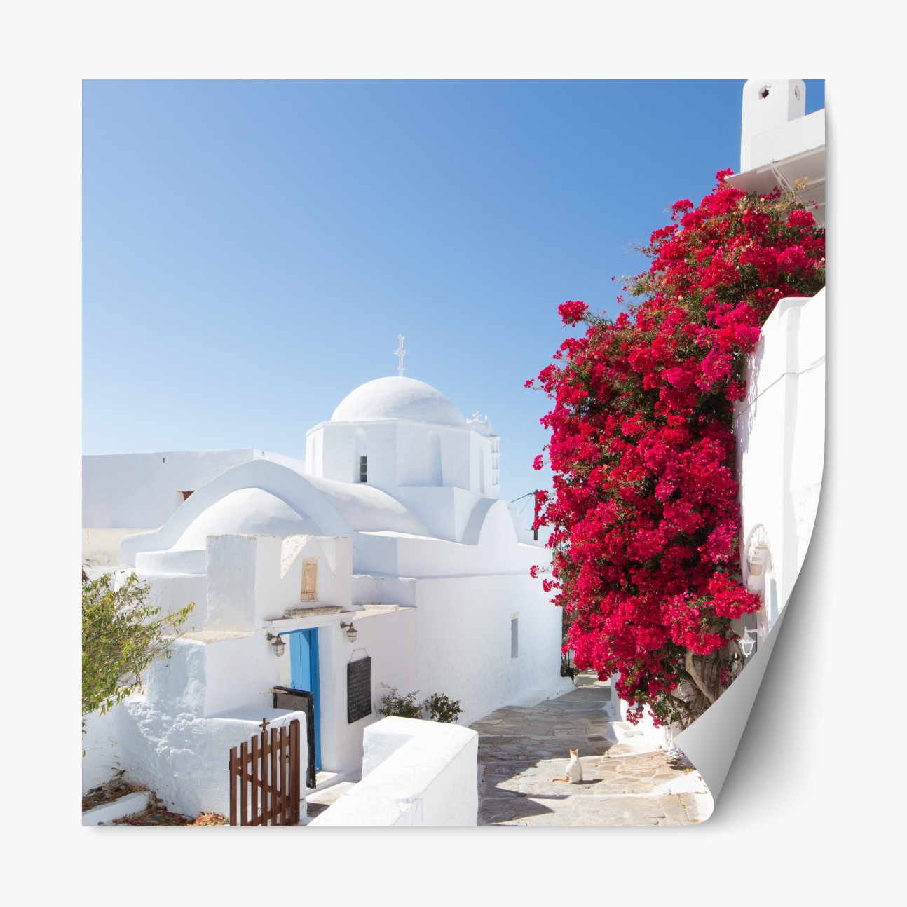 Naklejka repozycjonowalna Słoneczna ulica wyspy z bujną bugenwillą