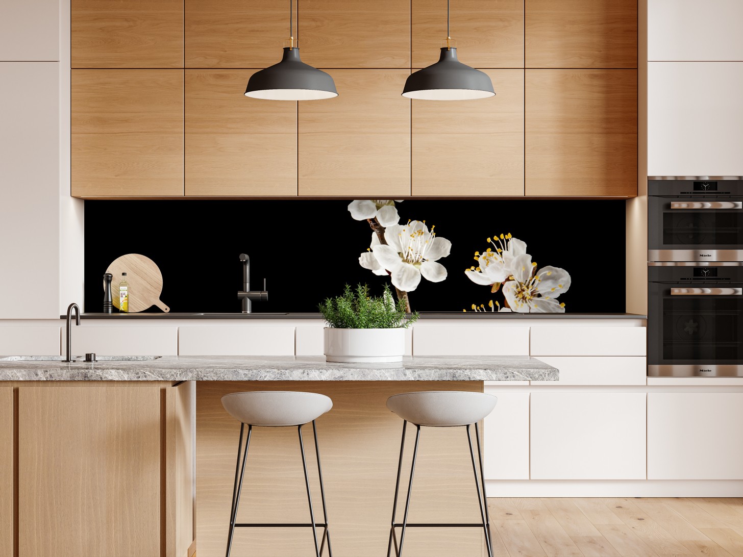 Naklejka repozycjonowalna Delikatna gałązka kwitnącej moreli na czarnym tle
