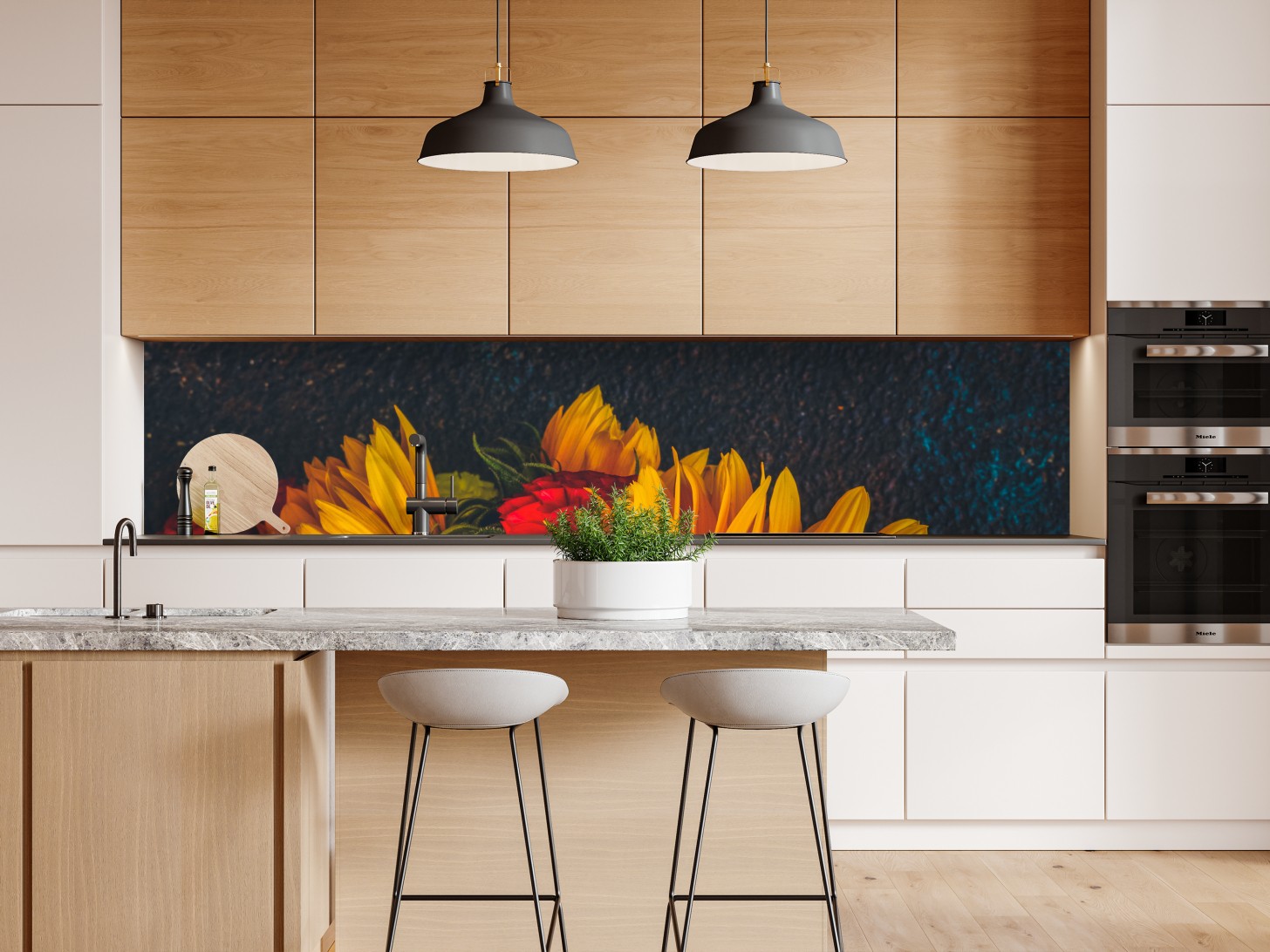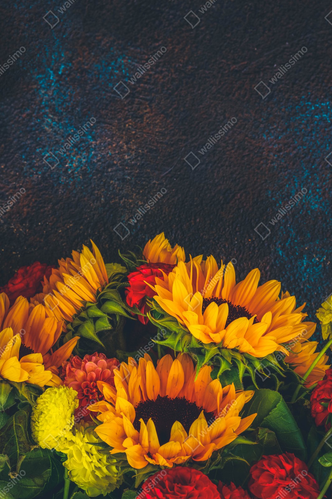 Naklejka repozycjonowalna Żywy bukiet słoneczników na ciemnym tle