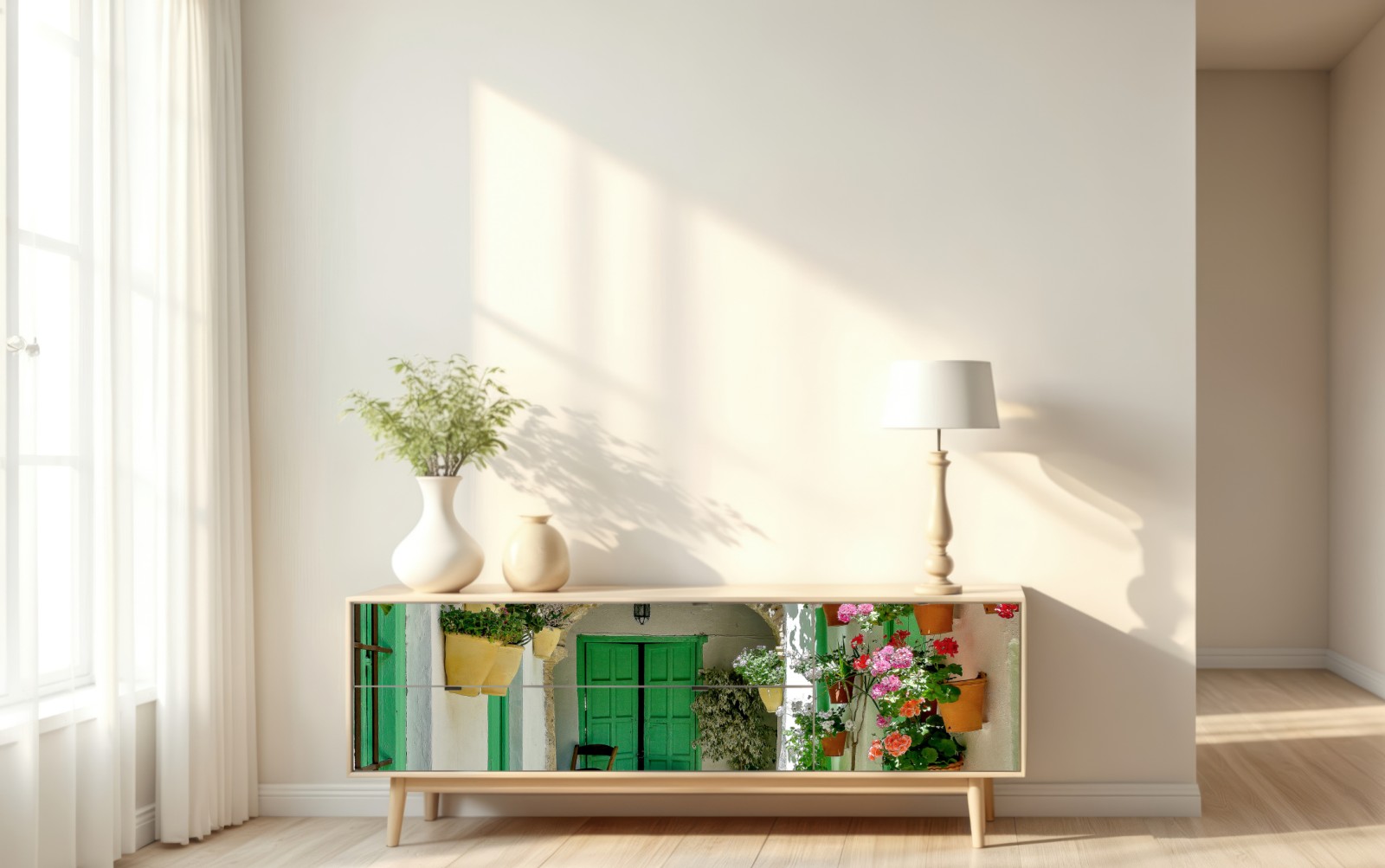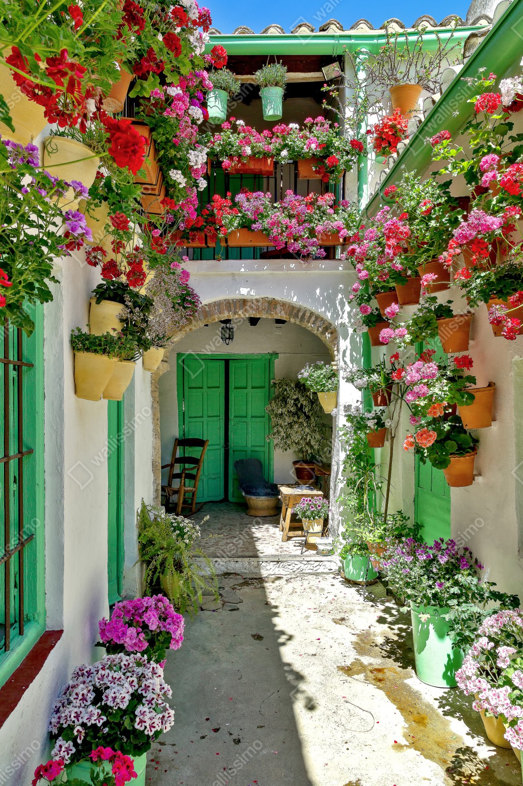 Naklejka repozycjonowalna Słoneczne podwórko pełne kwiatów i zielonych drzwi