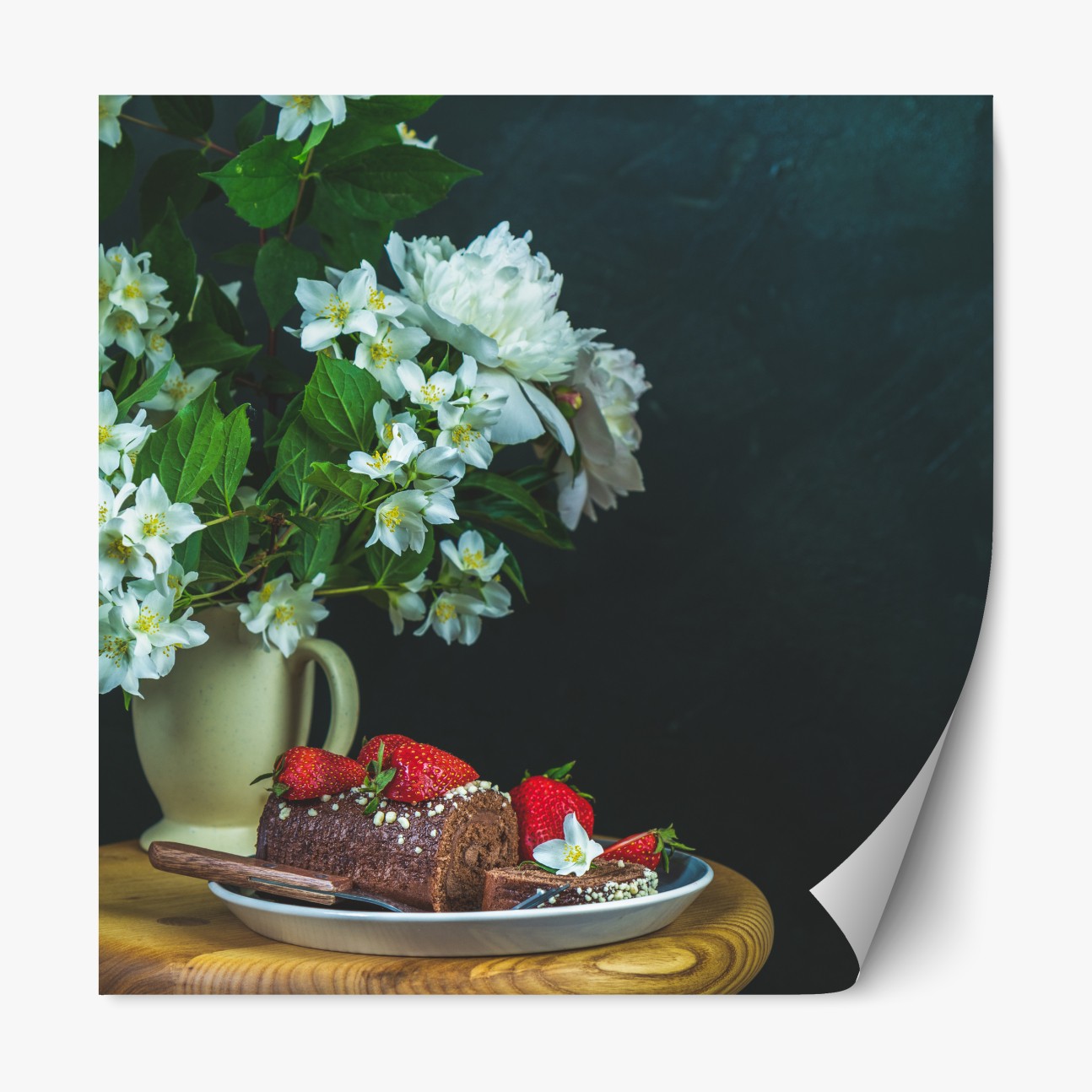 Naklejka repozycjonowalna Rolada czekoladowa z truskawkami i białymi kwiatami