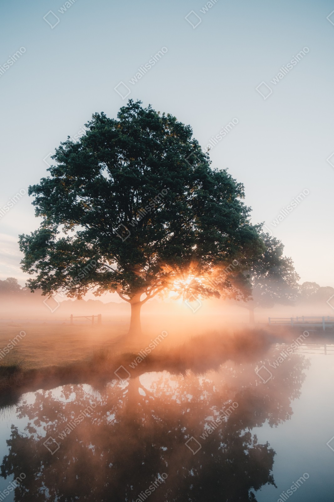 Naklejka repozycjonowalna Mglisty wschód słońca przy dębie