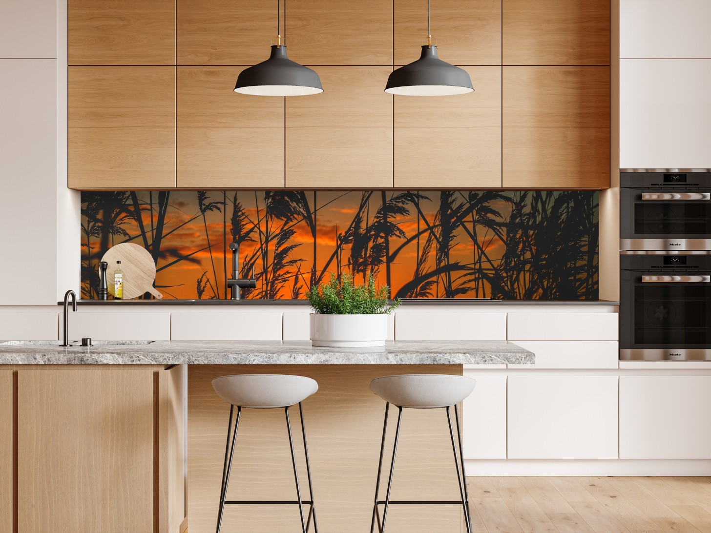 Naklejka repozycjonowalna Zachód słońca nad jeziorem z sitowiem w sylwecie
