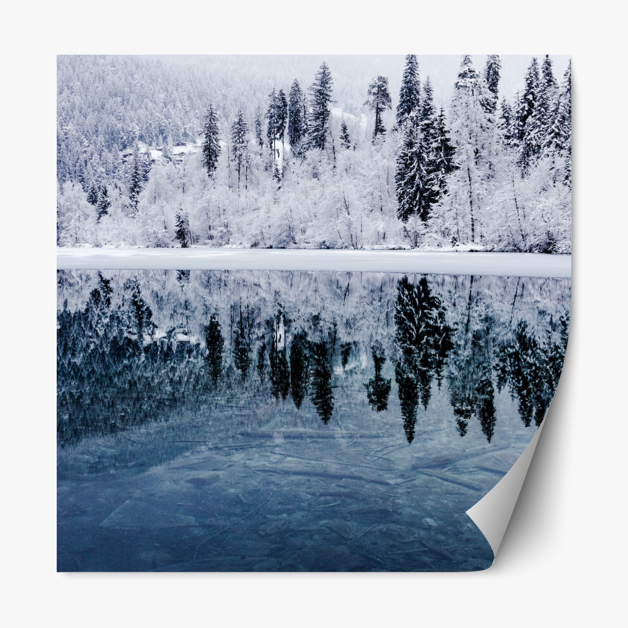Naklejka repozycjonowalna Zimowe jezioro z odbiciem w śnieżnym lesie
