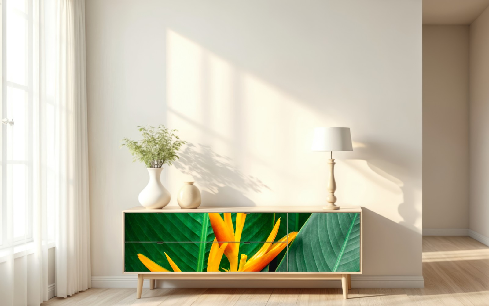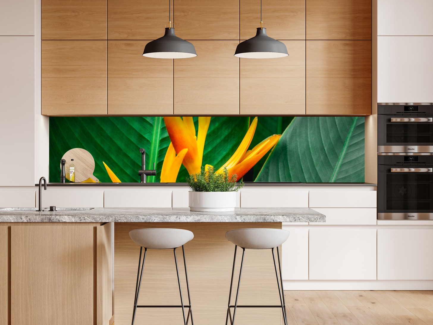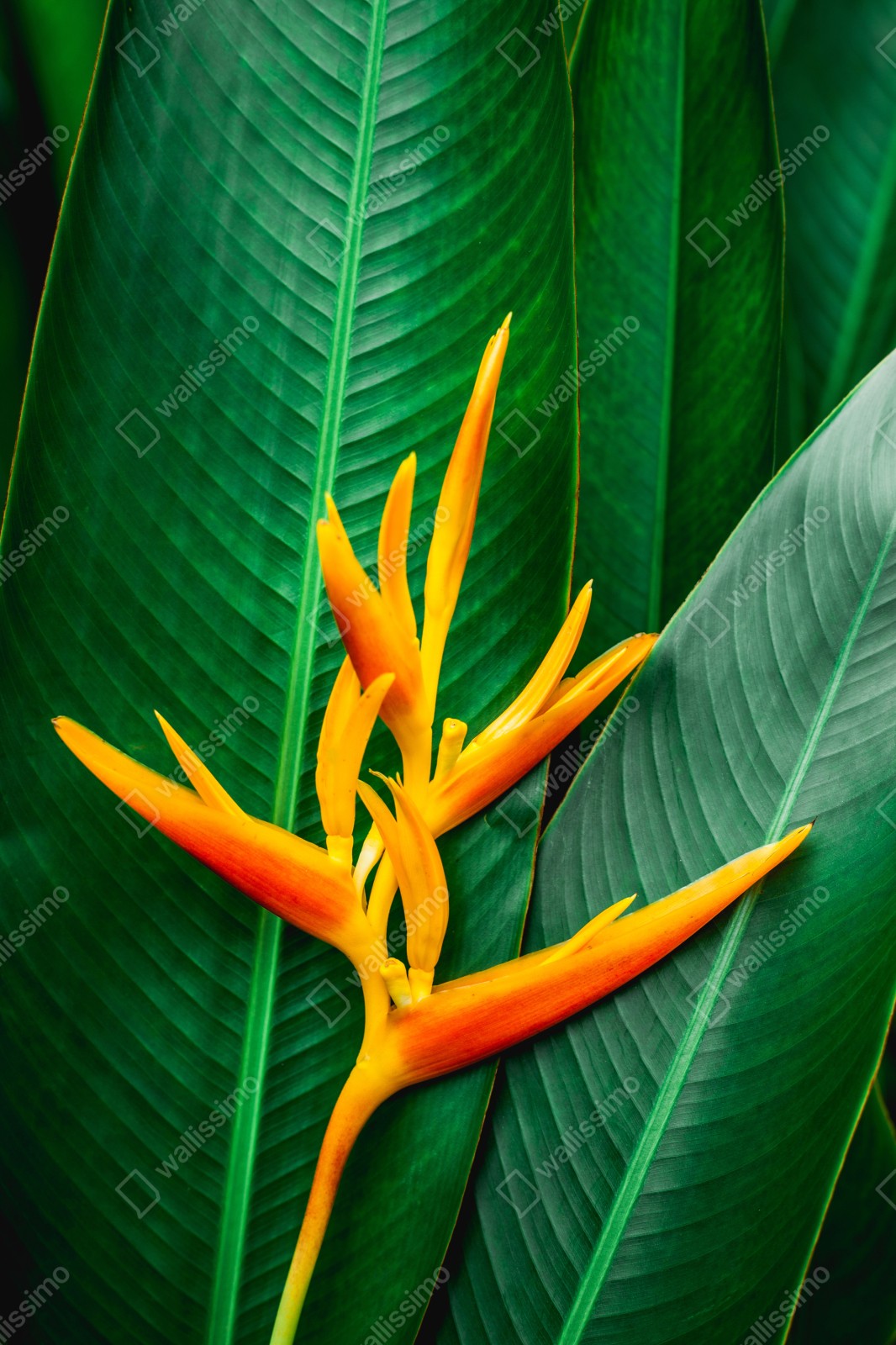Naklejka repozycjonowalna Żywa heliconia na zielonych liściach