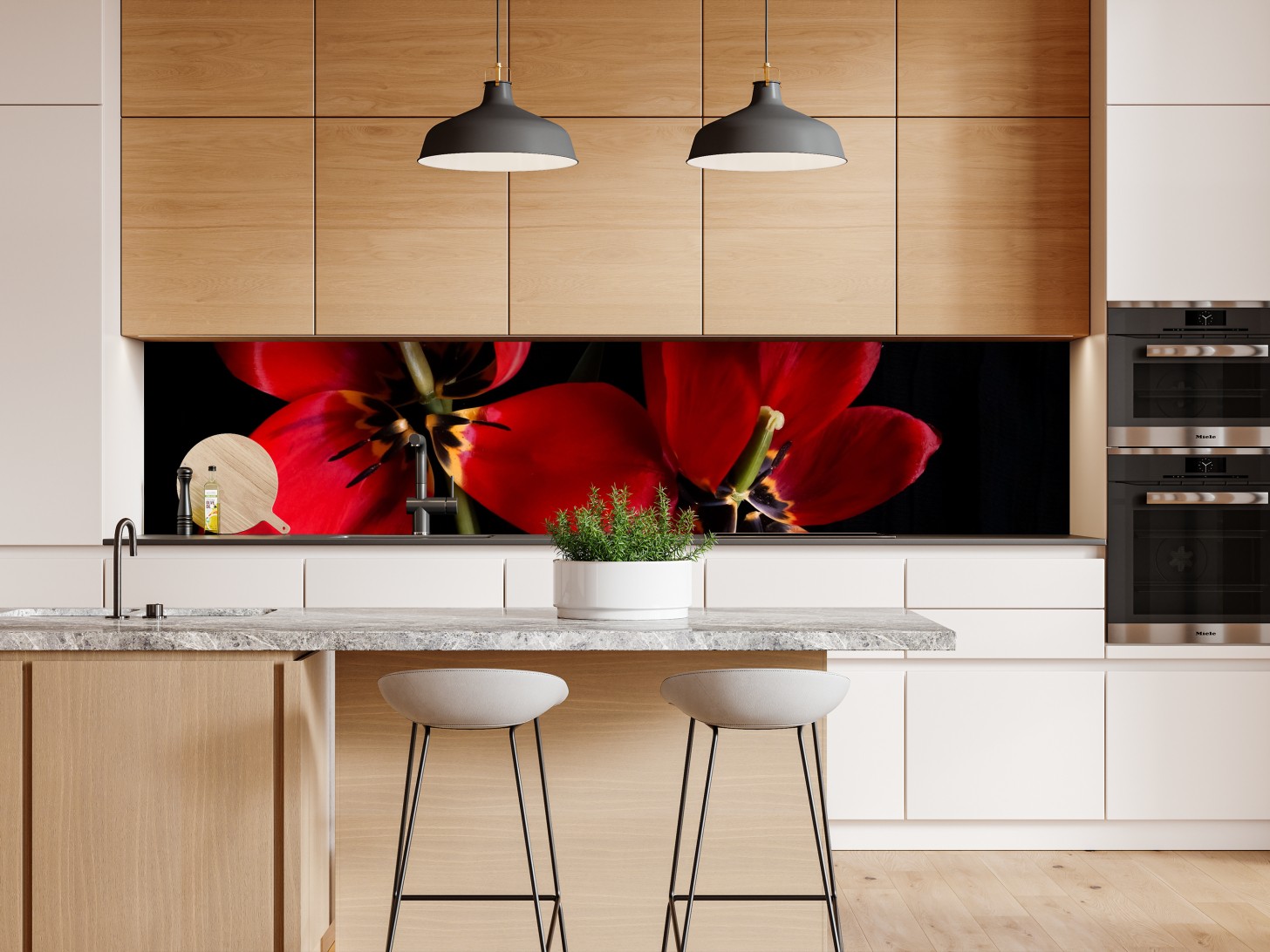 Naklejka repozycjonowalna Trzy czerwone tulipany na czarnym tle