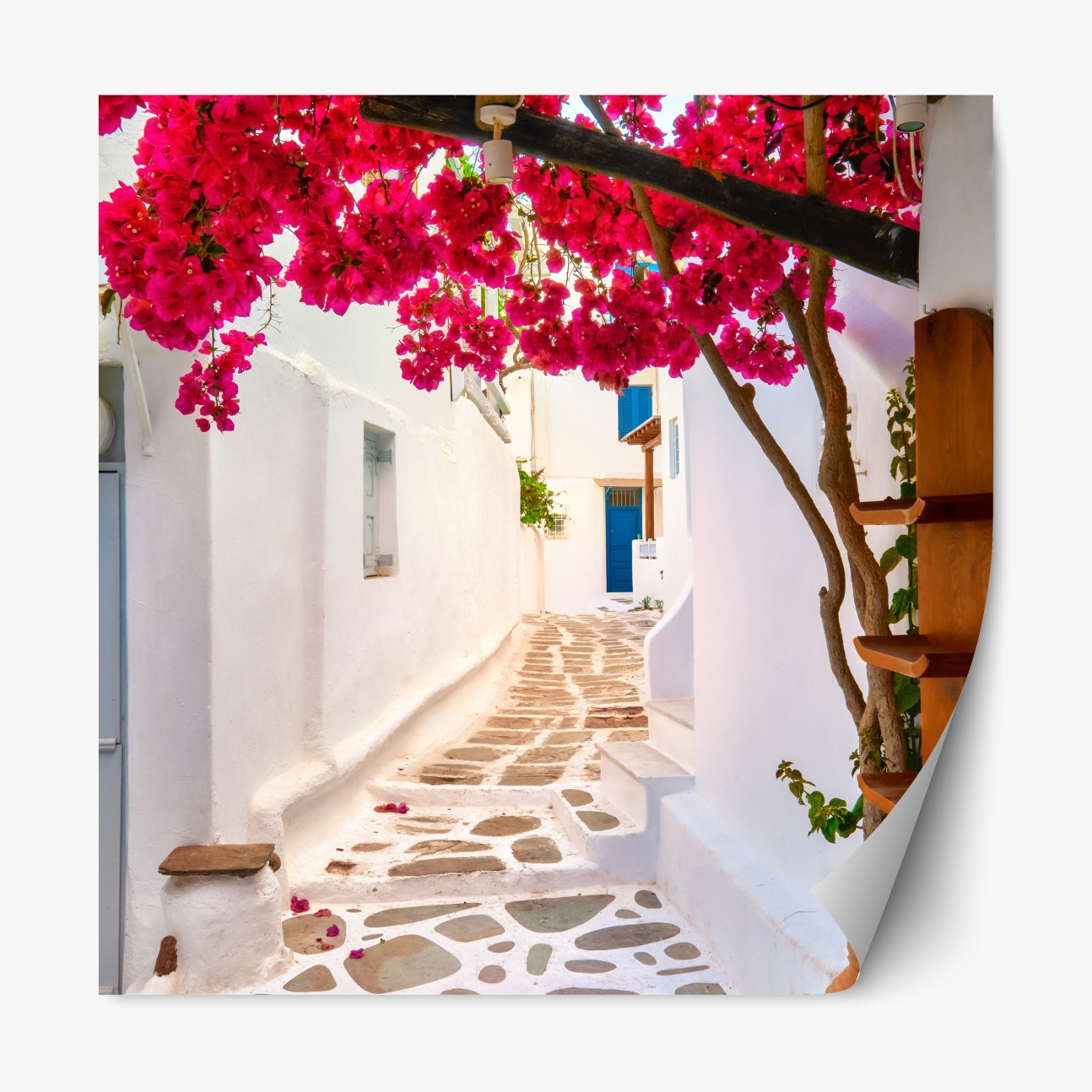 Naklejka repozycjonowalna Słoneczna uliczka grecka z bugenwillą