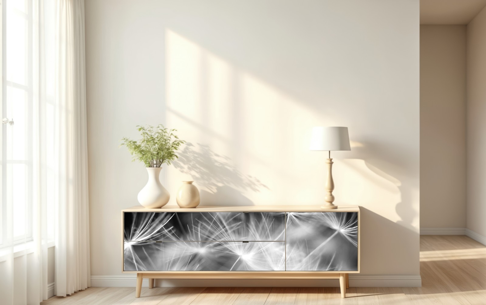 Naklejka repozycjonowalna Delikatne nasiona dmuchawca czarno-białe
