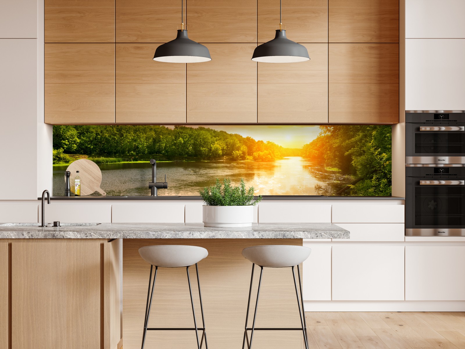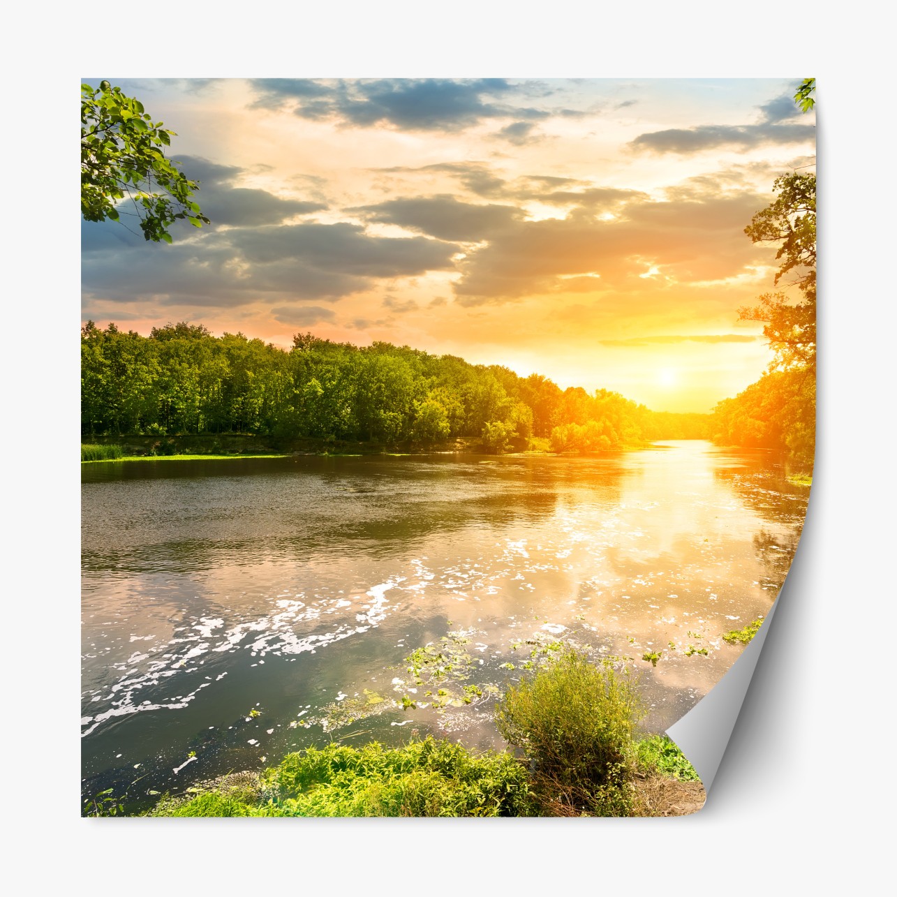 Naklejka repozycjonowalna Spokojny zachód słońca nad rzeką i zielonym lasem