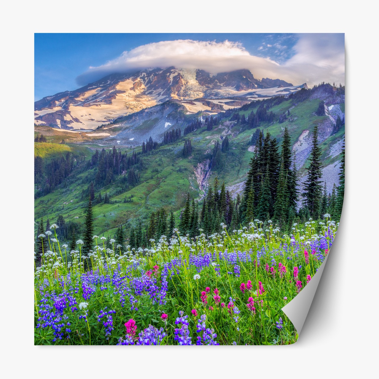 Naklejka repozycjonowalna Alpejska łąka pełna kwiatów u stóp ośnieżonych szczytów