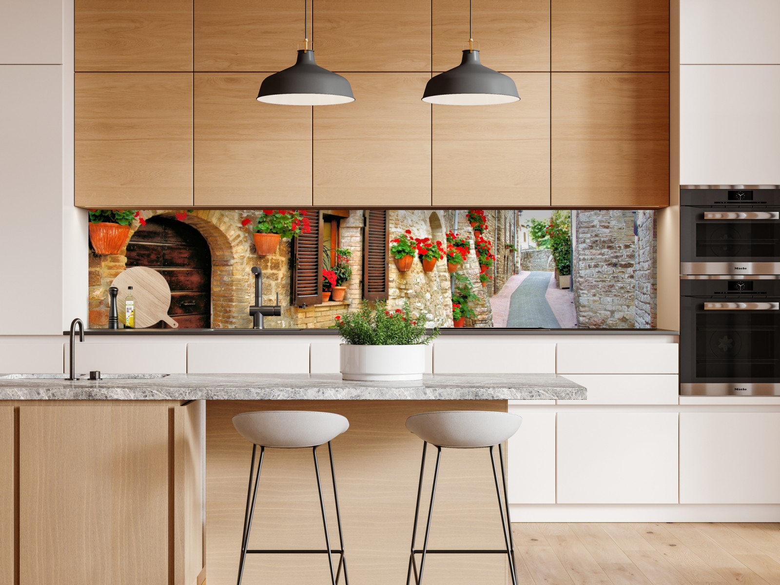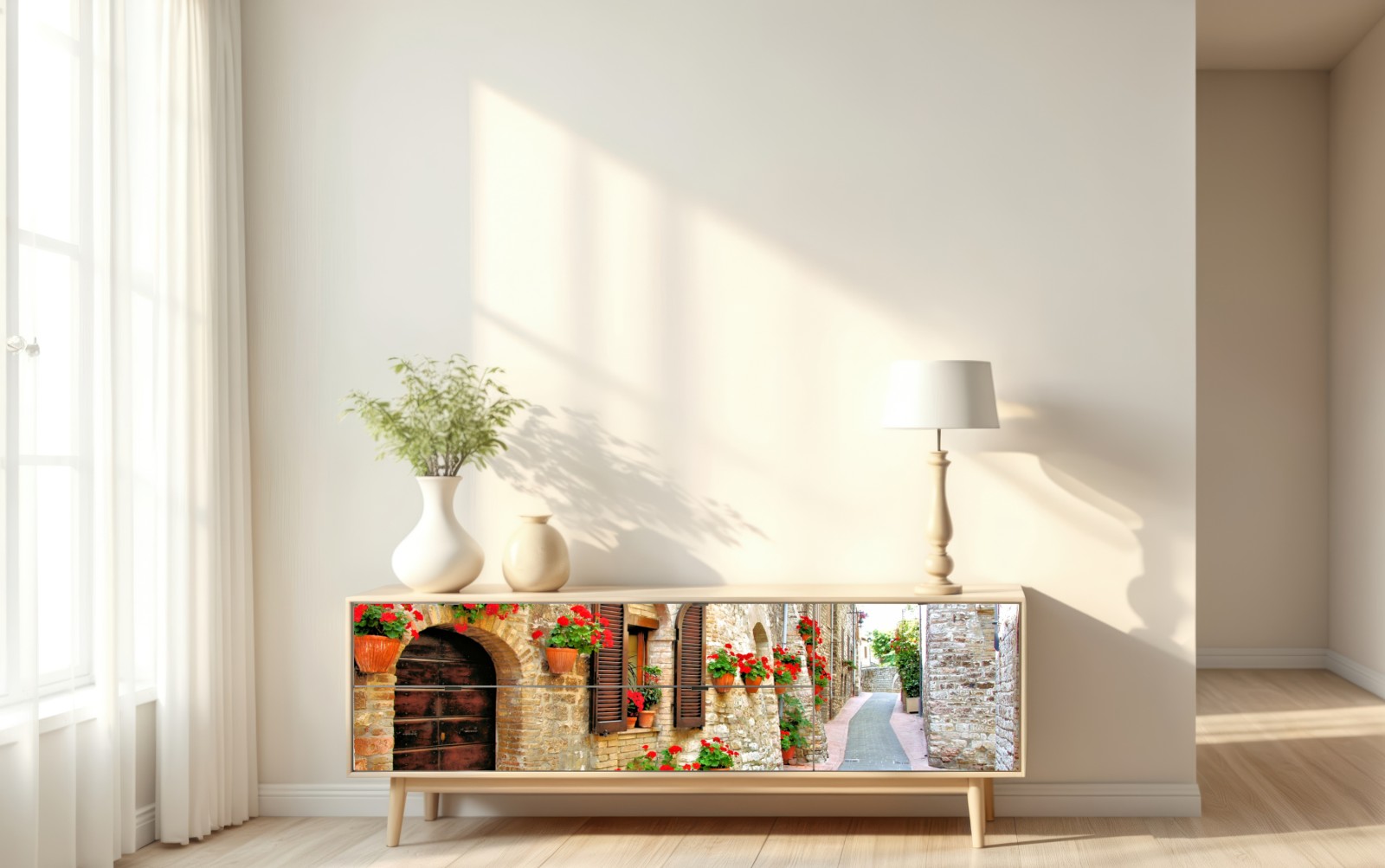 Naklejka repozycjonowalna Słoneczna kamienna uliczka z czerwonymi pelargoniami