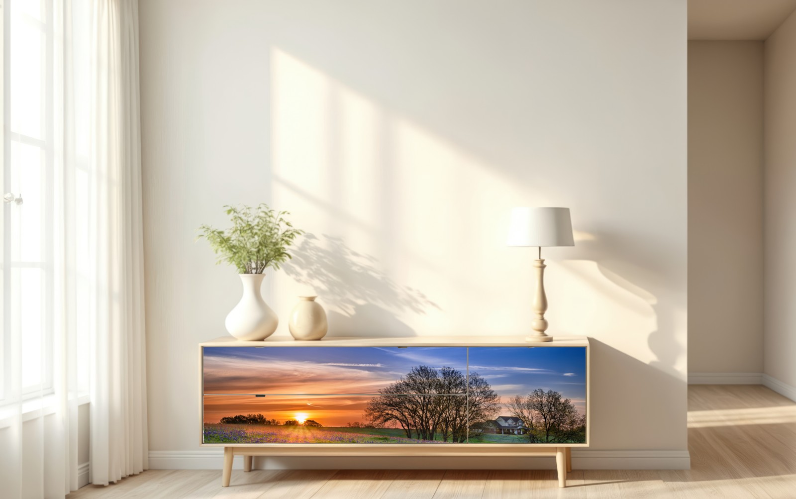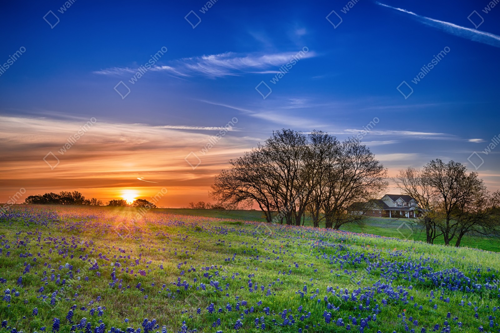 Naklejka repozycjonowalna Teksas łąka bluebonnetów o wschodzie słońca