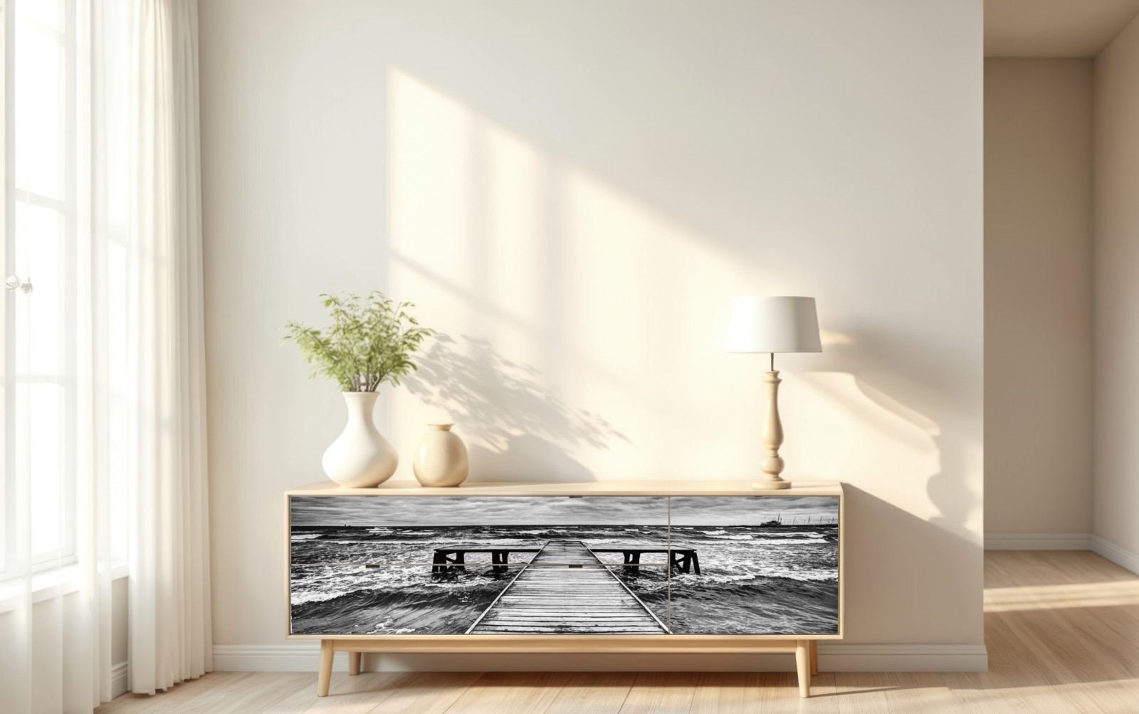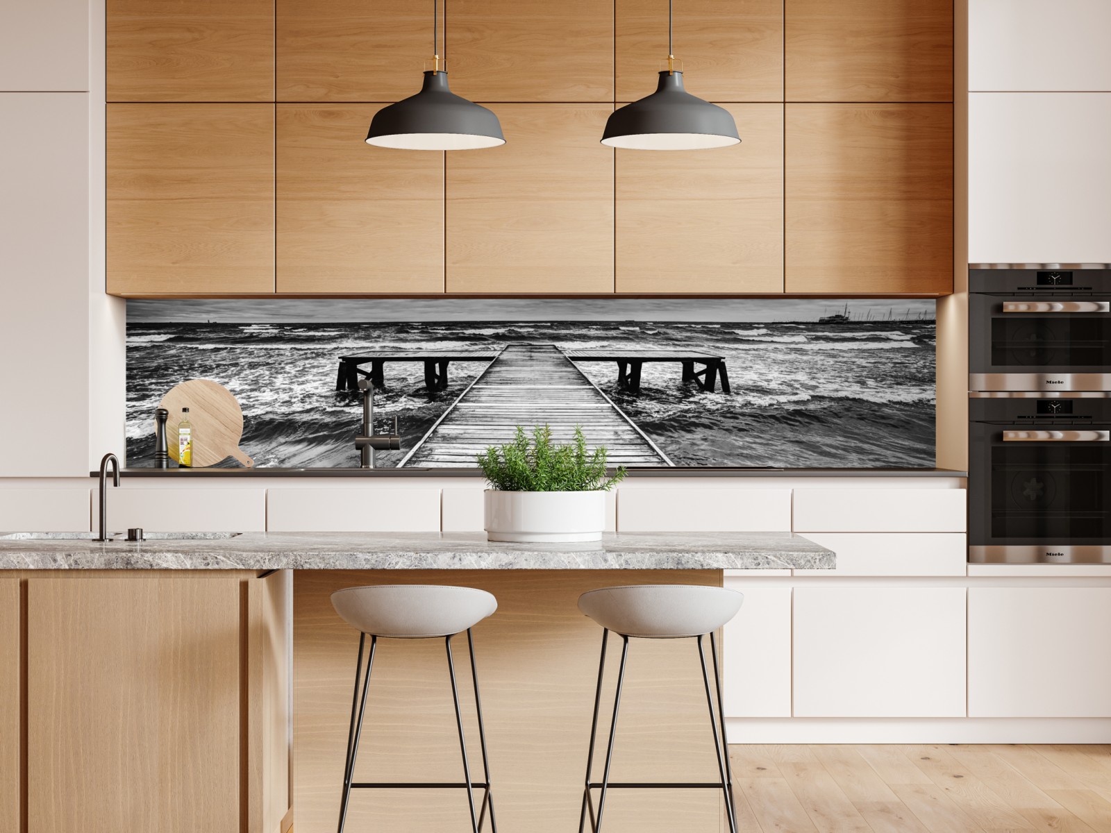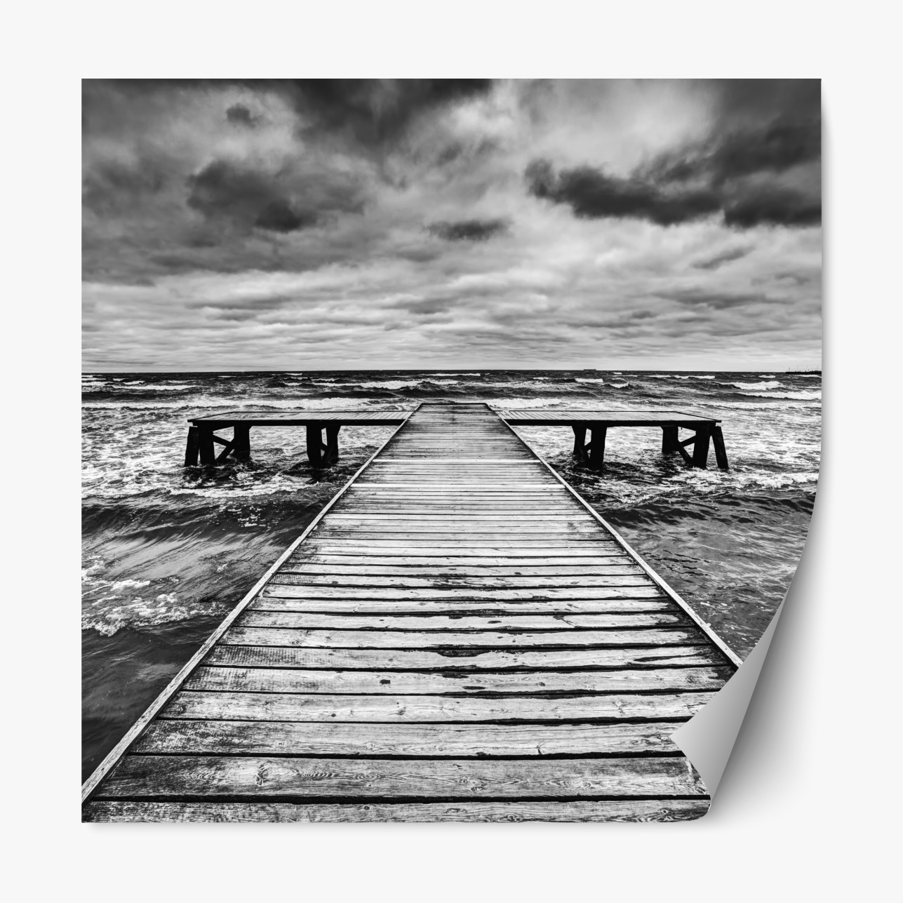 Naklejka repozycjonowalna Dramatyczne czarno-białe molo prowadzące w burzliwe morze