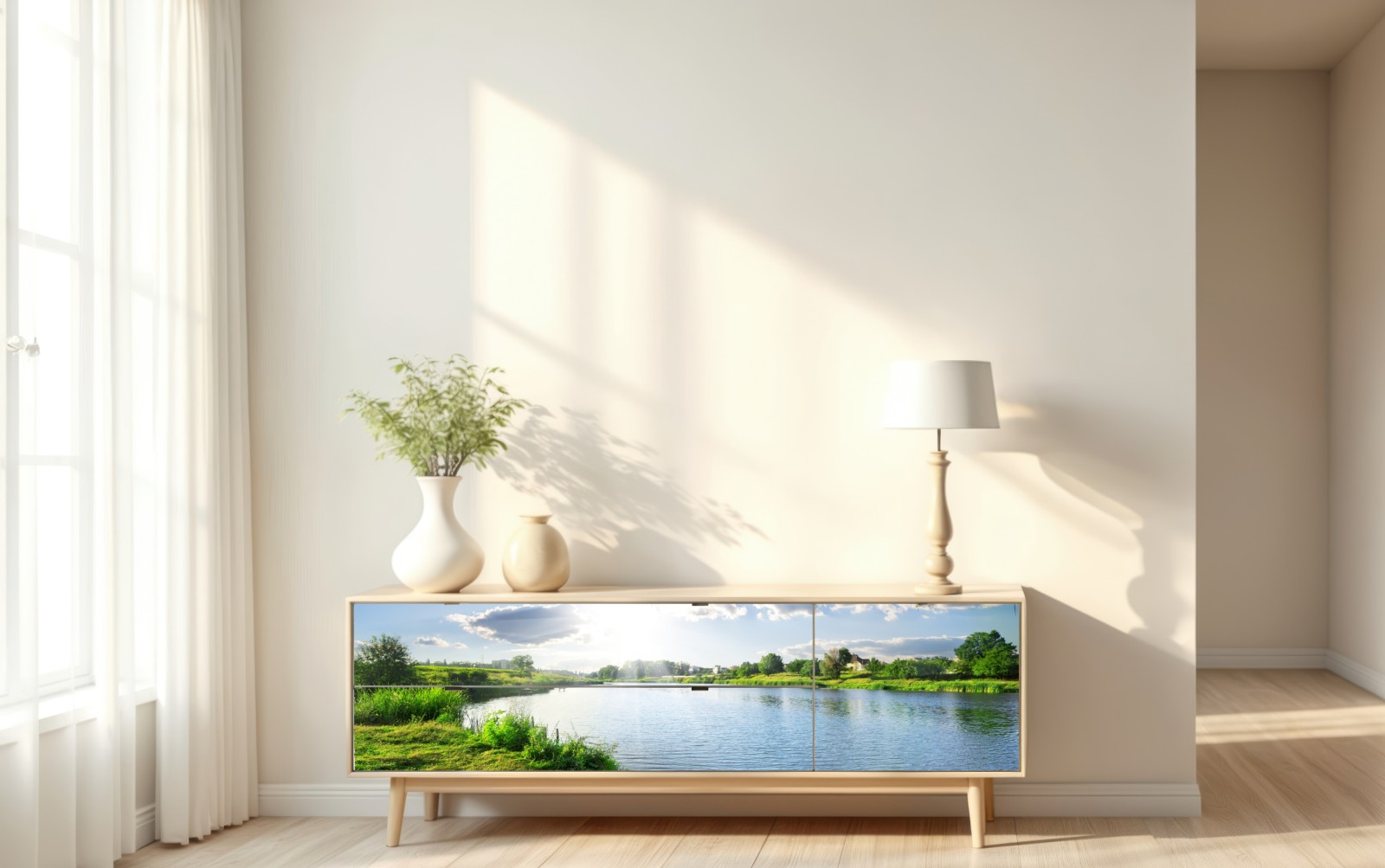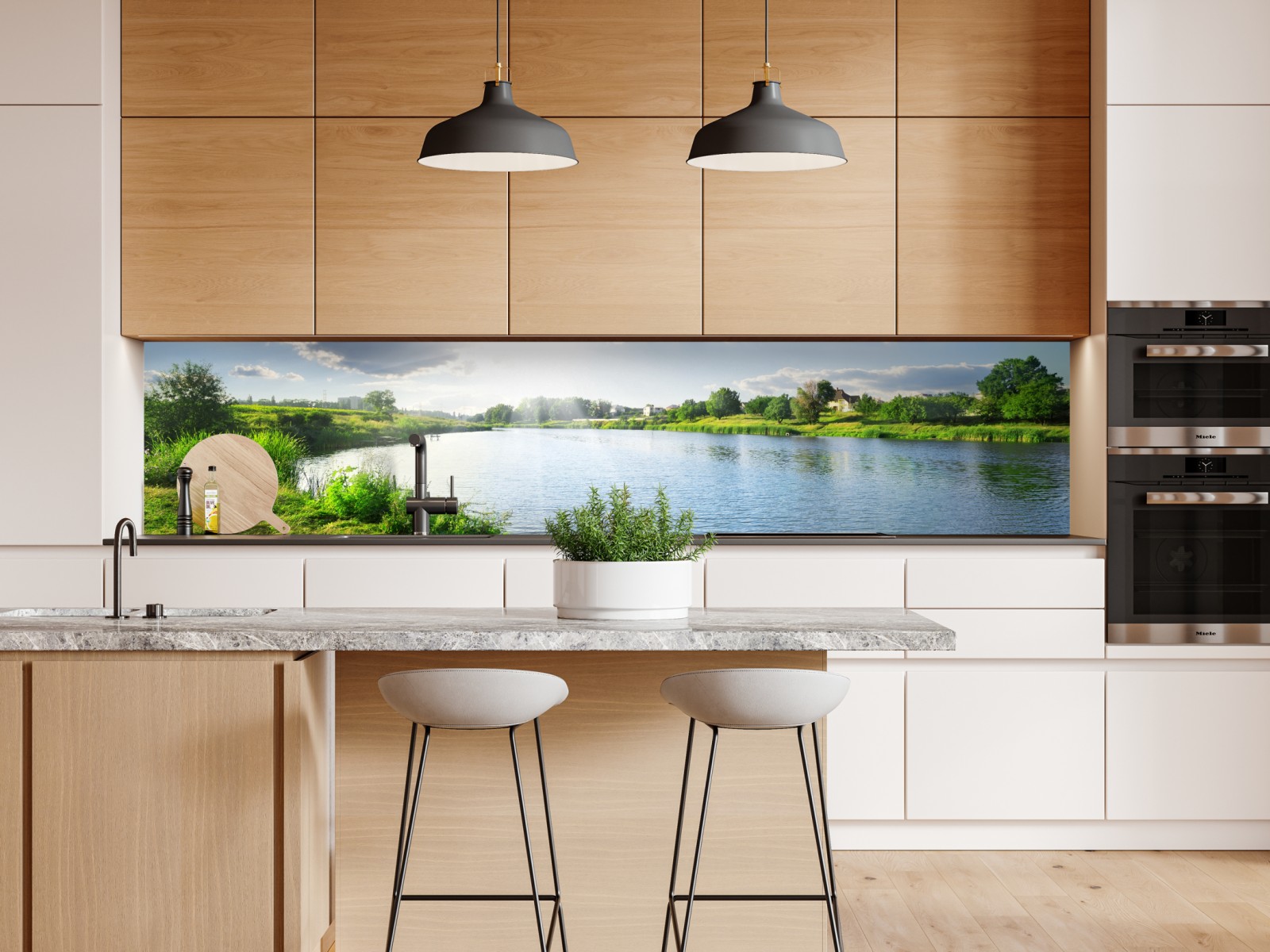 Naklejka repozycjonowalna Nasłoneczniony brzeg rzeki z bujną zielenią