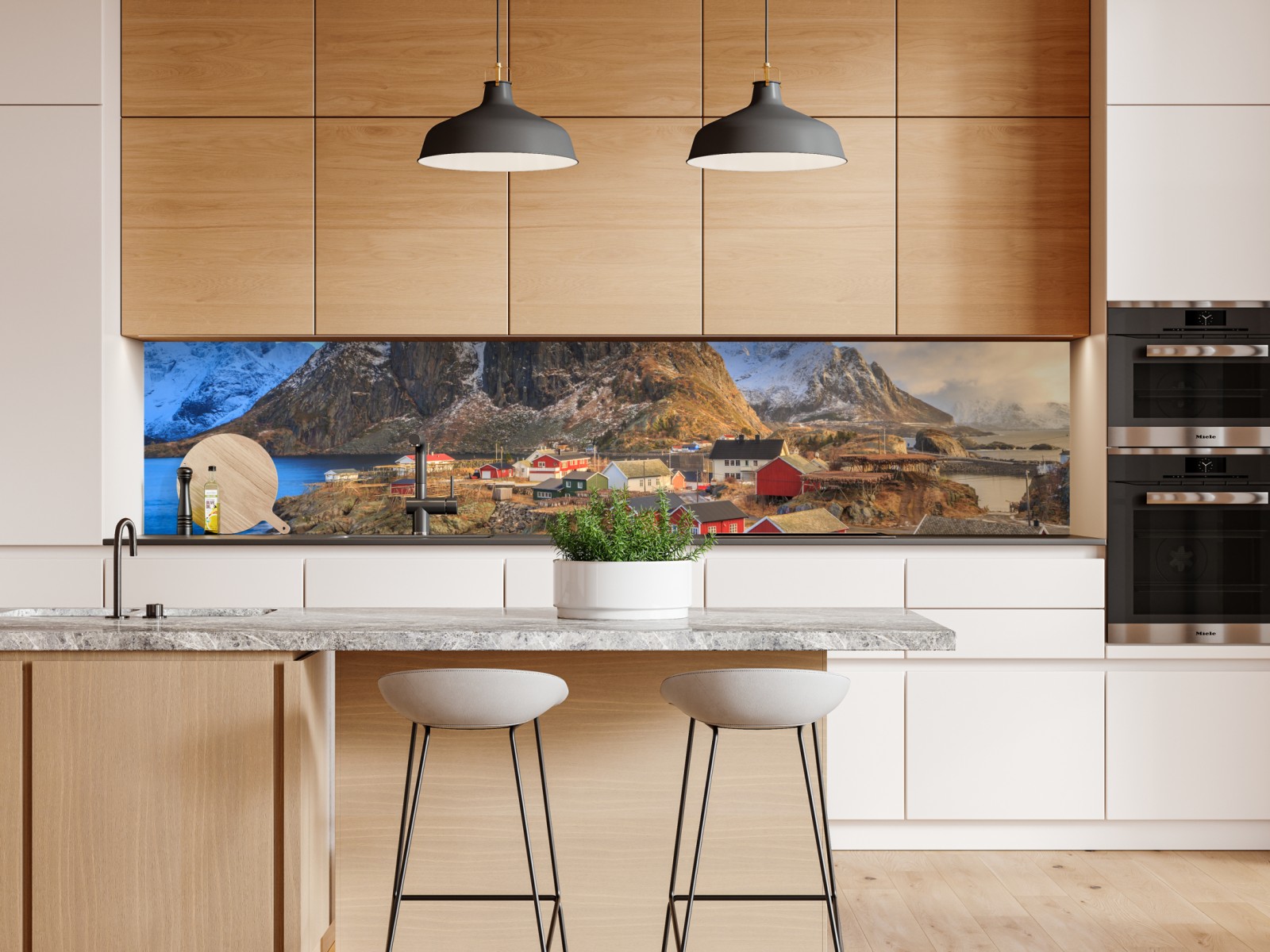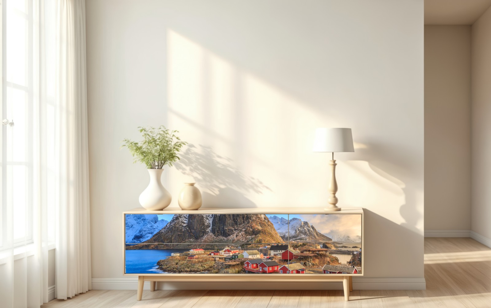 Naklejka repozycjonowalna Wioska nadbrzeżna w Norwegii z czerwonymi domkami