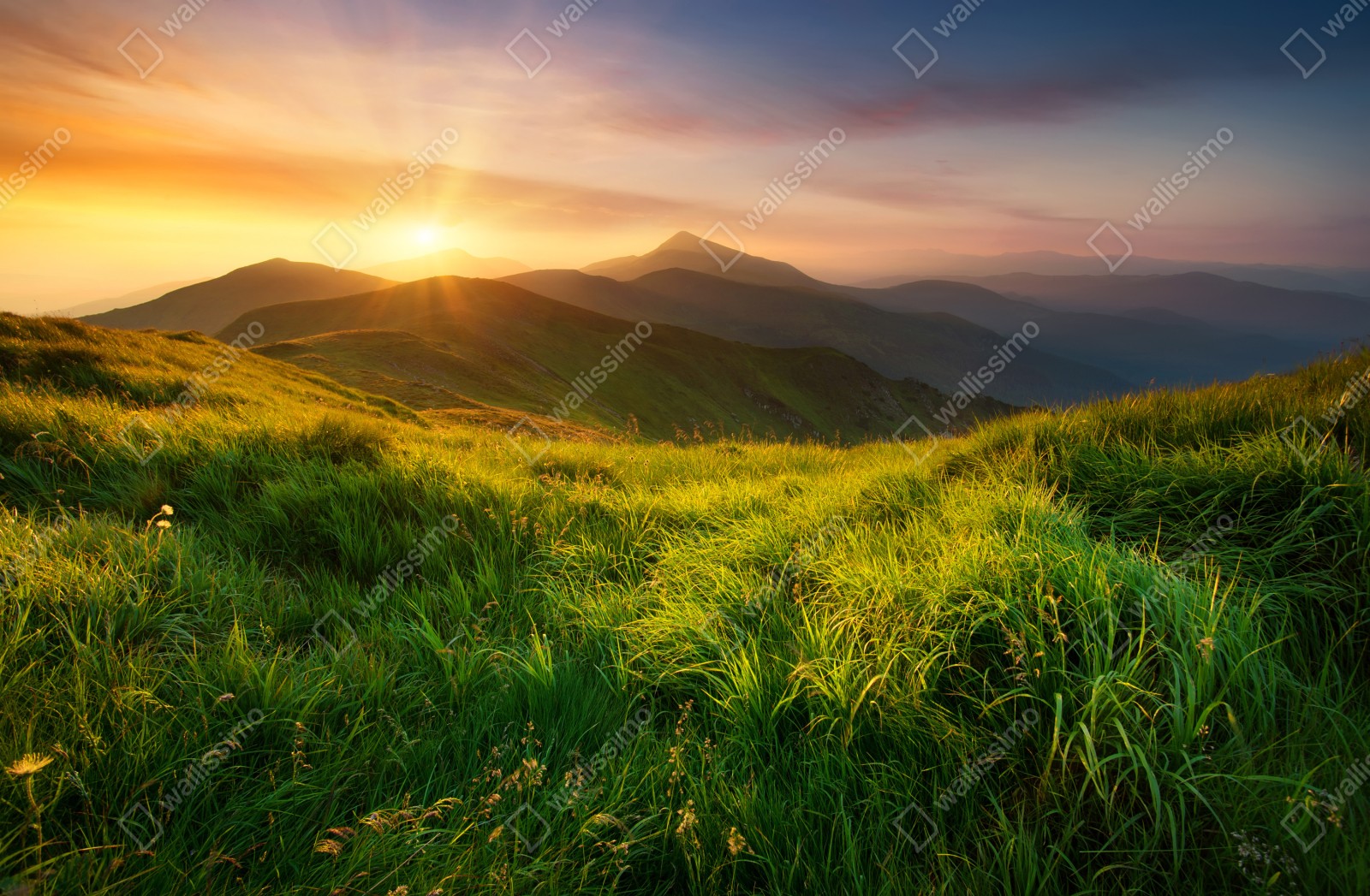 Naklejka repozycjonowalna Wschód słońca nad zieloną doliną górską