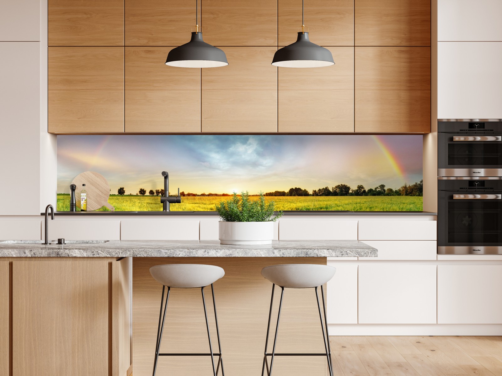 Naklejka repozycjonowalna Tęcza nad złotym polem pszenicy o zachodzie słońca