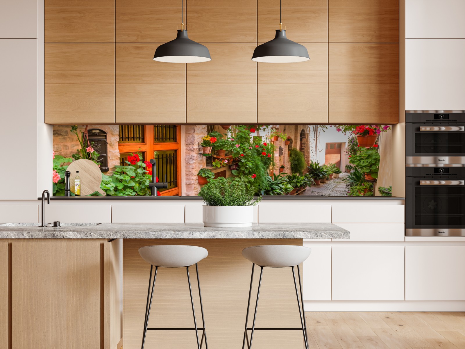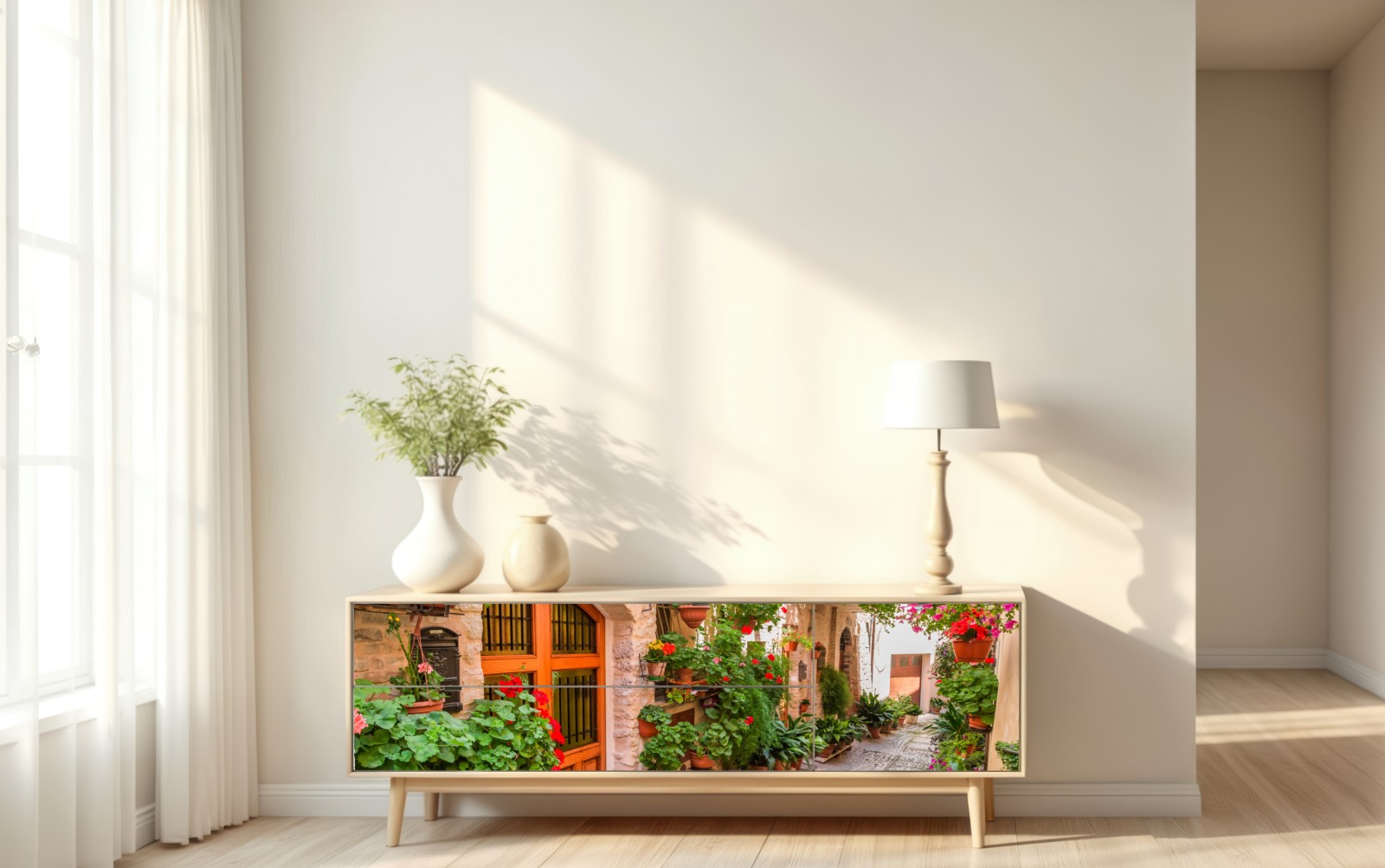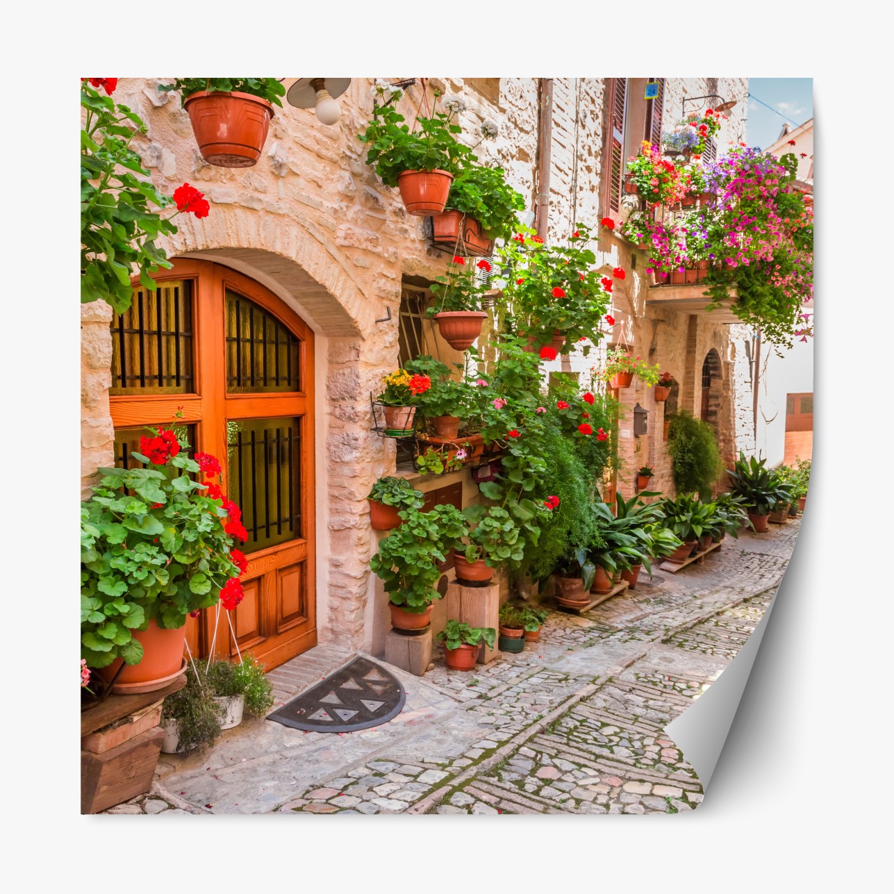 Naklejka repozycjonowalna Słoneczna uliczka we Włochach z kwitnącymi donicami