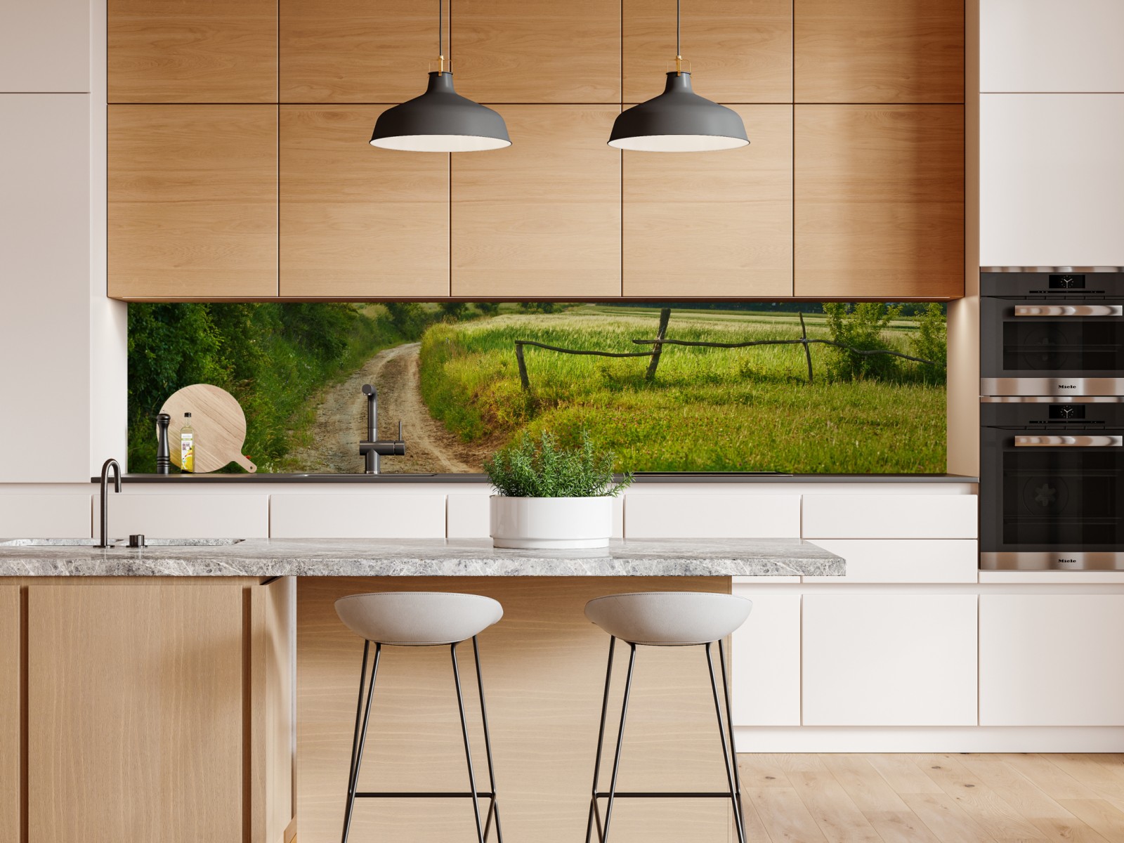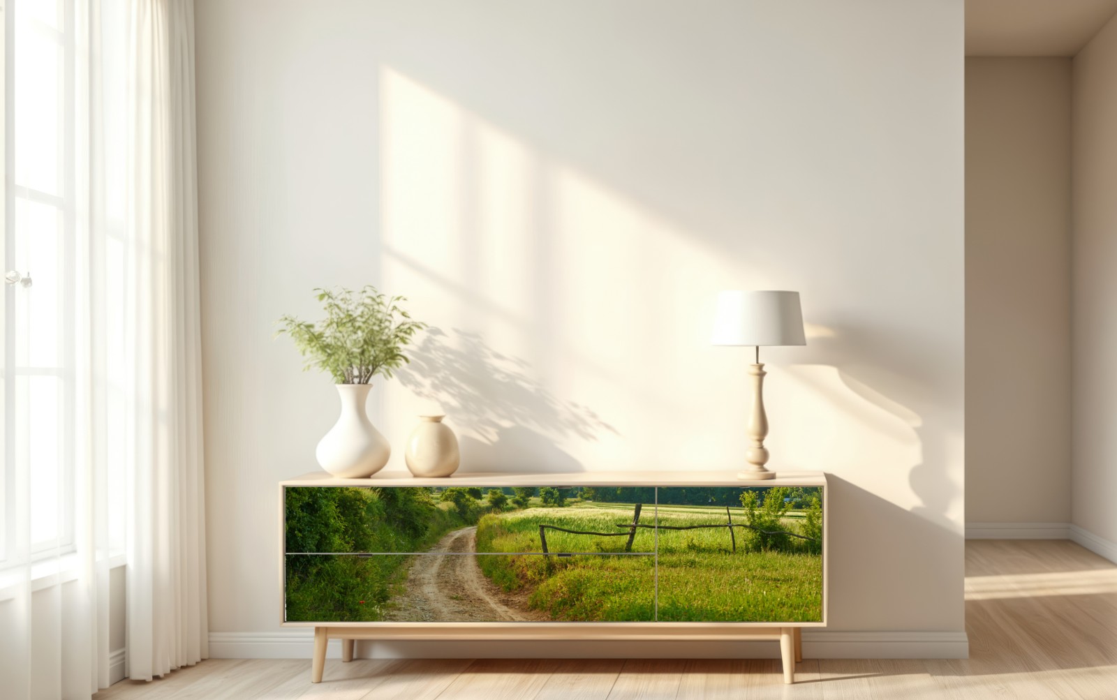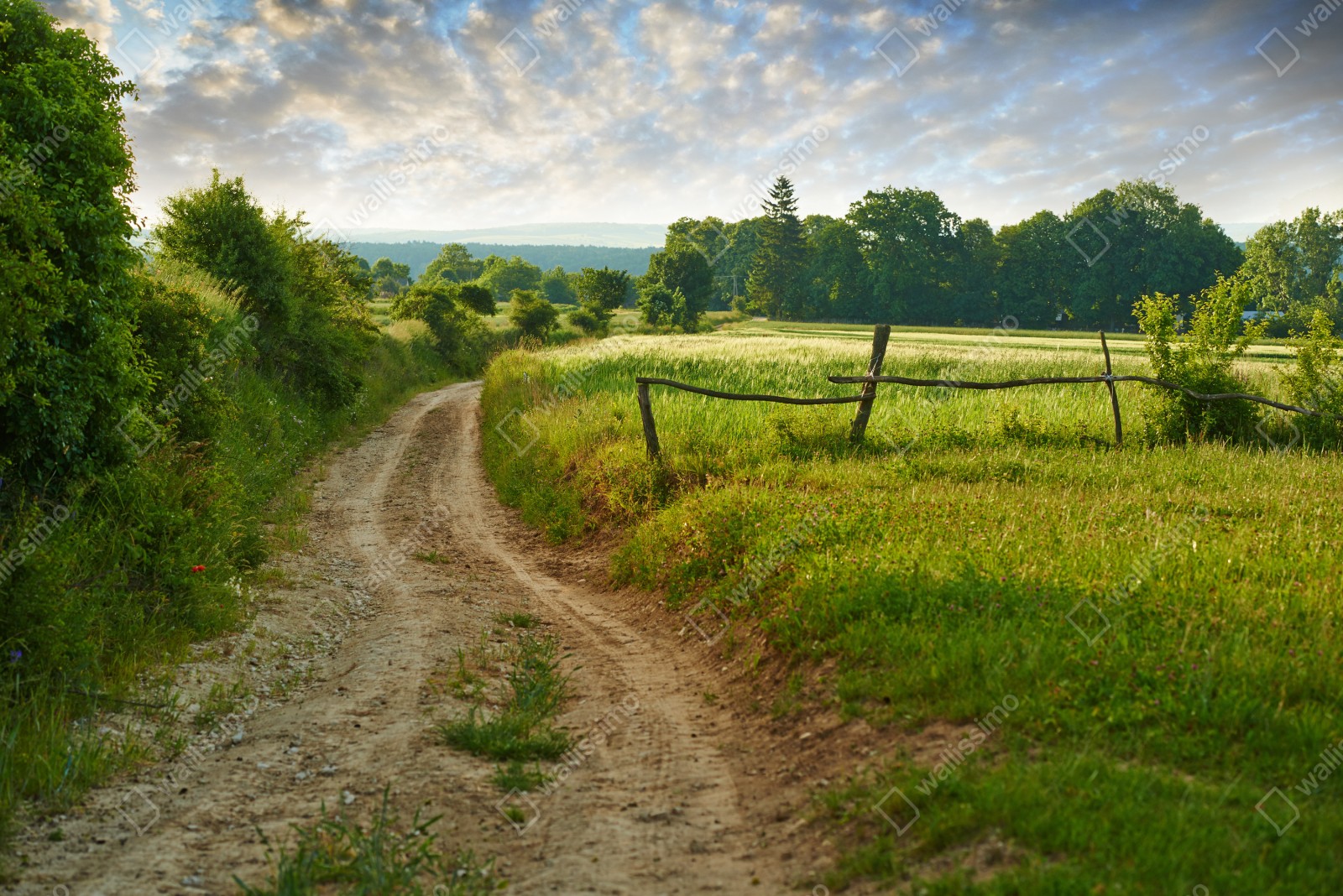 Naklejka repozycjonowalna Słoneczna wiejska ścieżka przez zielone łąki