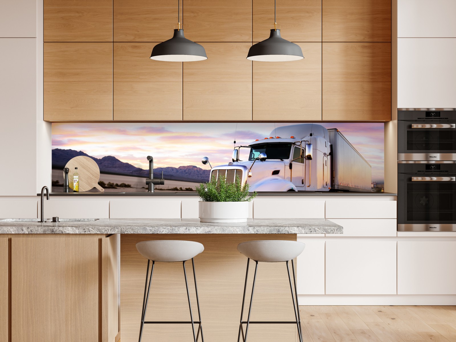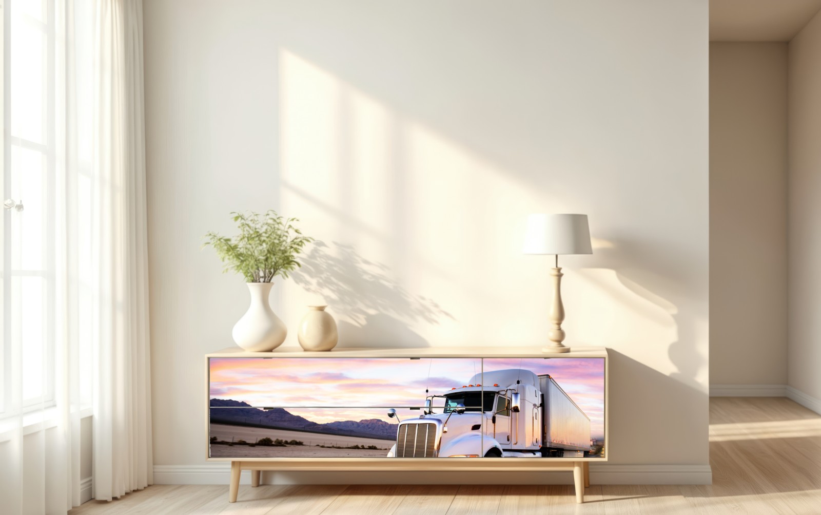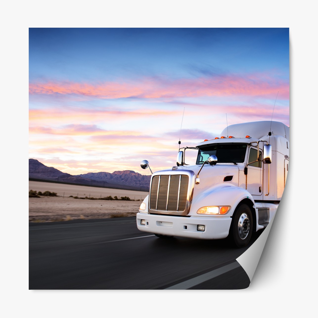 Naklejka repozycjonowalna Ciężarówka w ruchu o zachodzie słońca