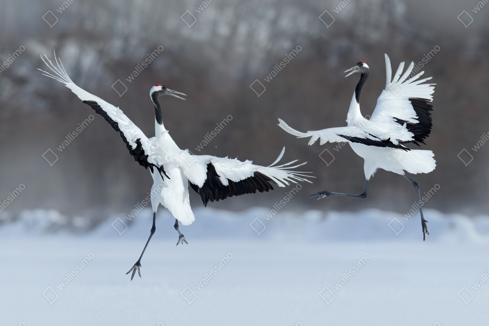 Naklejka repozycjonowalna Tańczące żurawie koroniaste na śniegu, Hokkaido