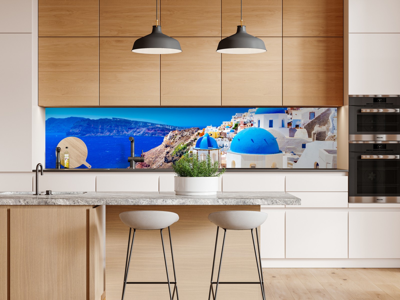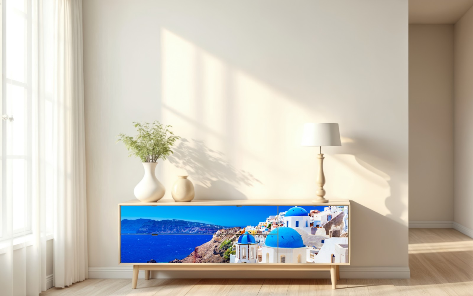 Naklejka repozycjonowalna Santorini niebieskie kopuły nad Morzem Egejskim