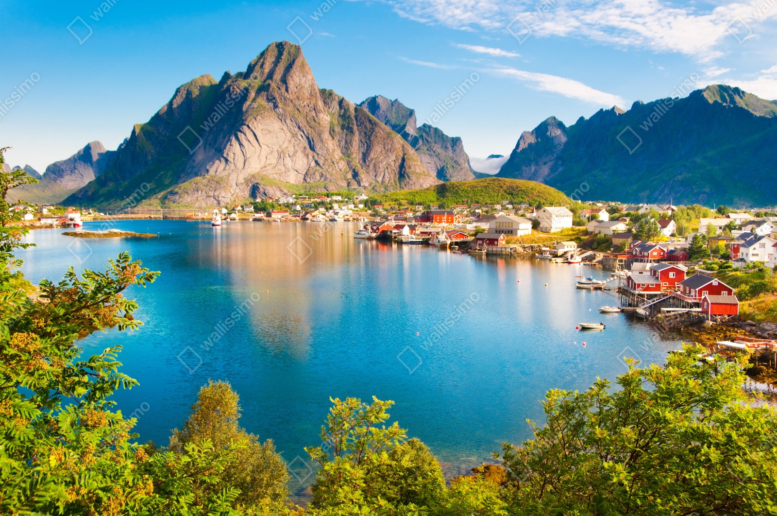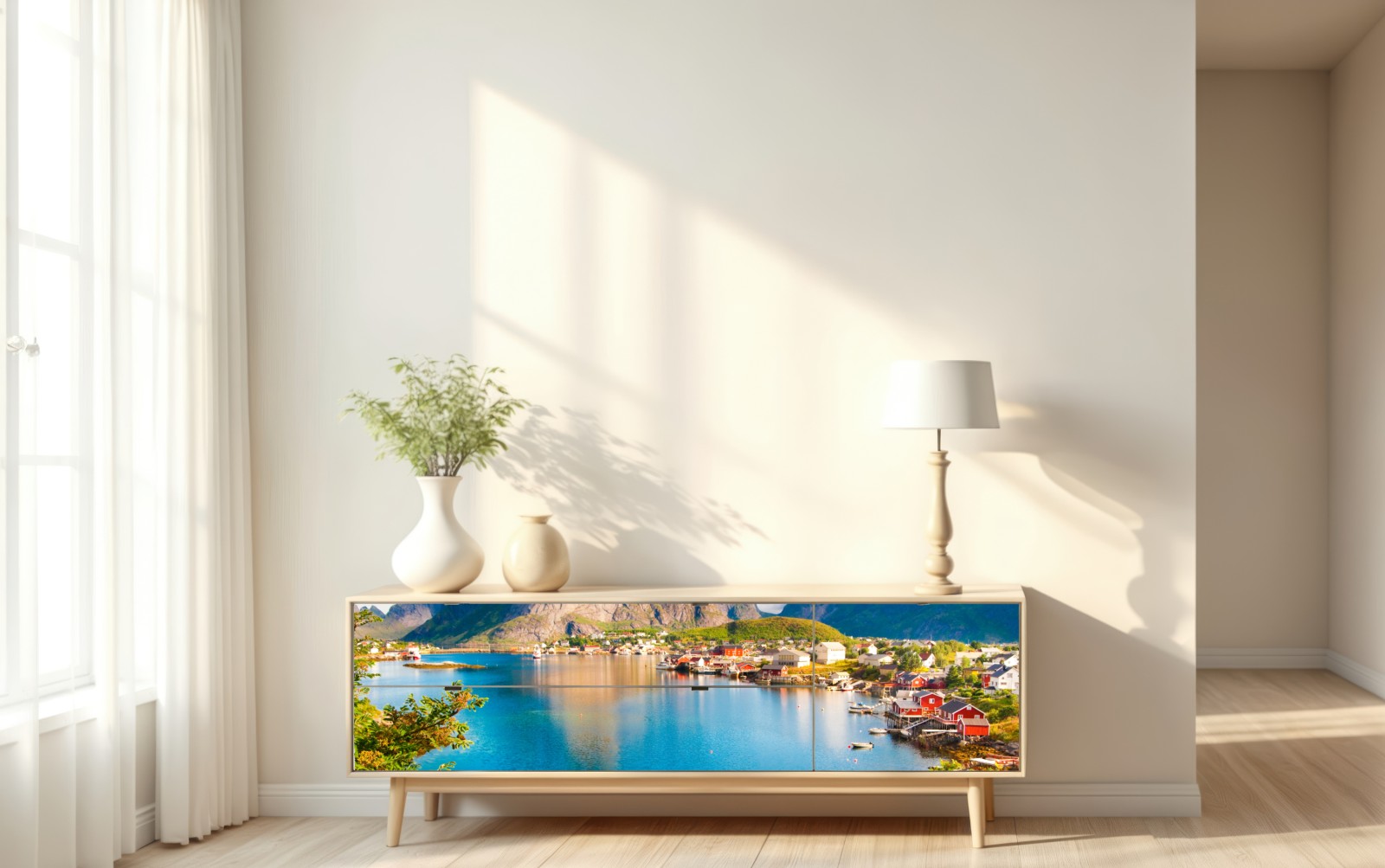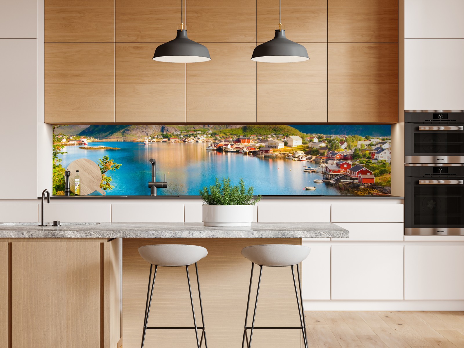 Naklejka repozycjonowalna Malowniczy fiord z górską wioską i odbiciami