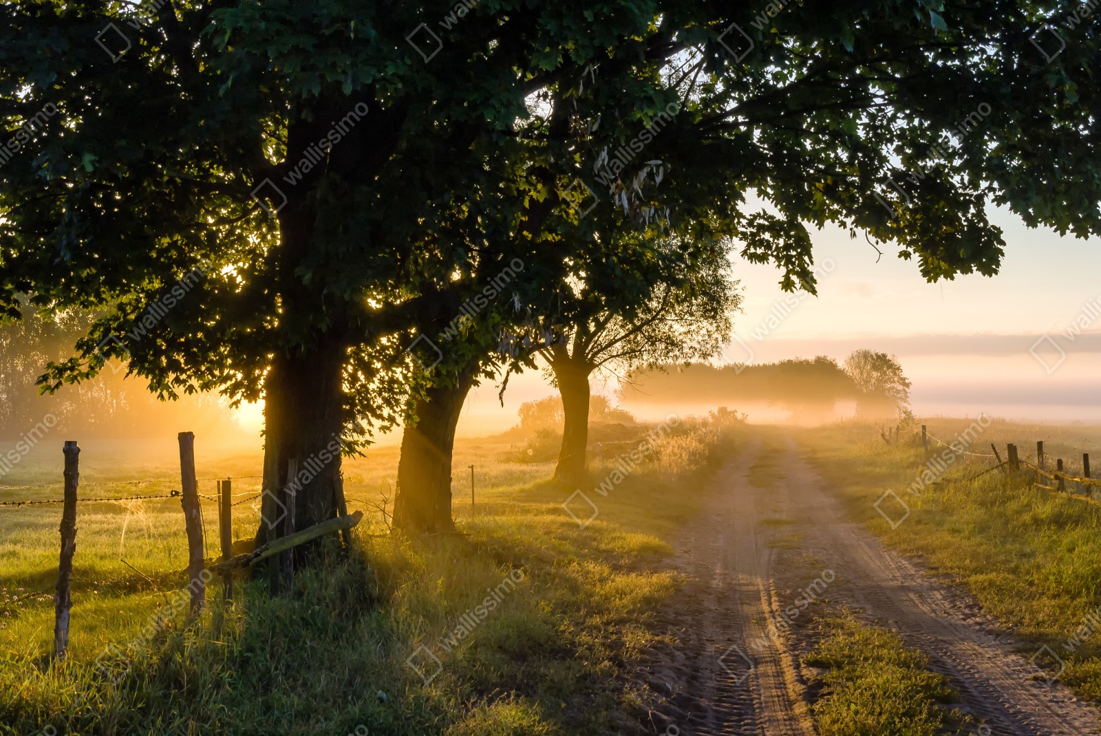 Naklejka repozycjonowalna Słoneczna wiejska droga o świcie