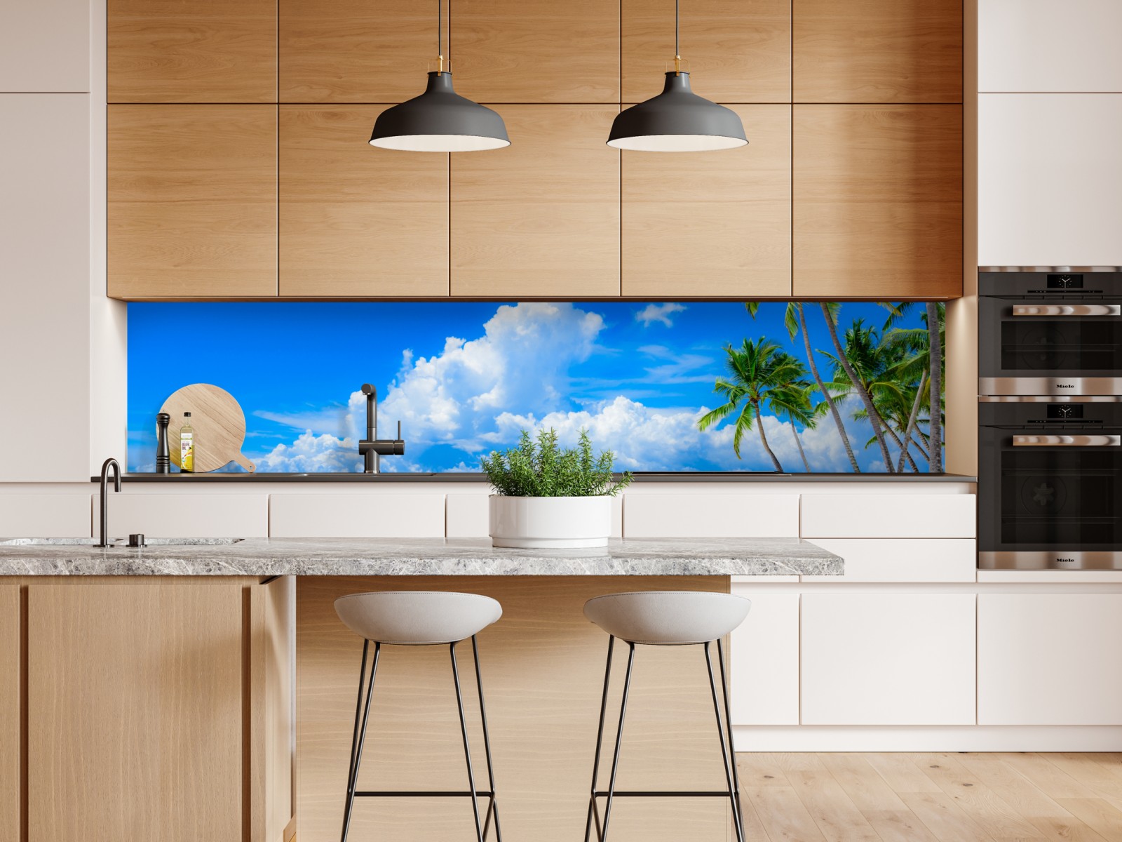 Naklejka repozycjonowalna Tropikalna plaża z palmami pod błękitnym niebem