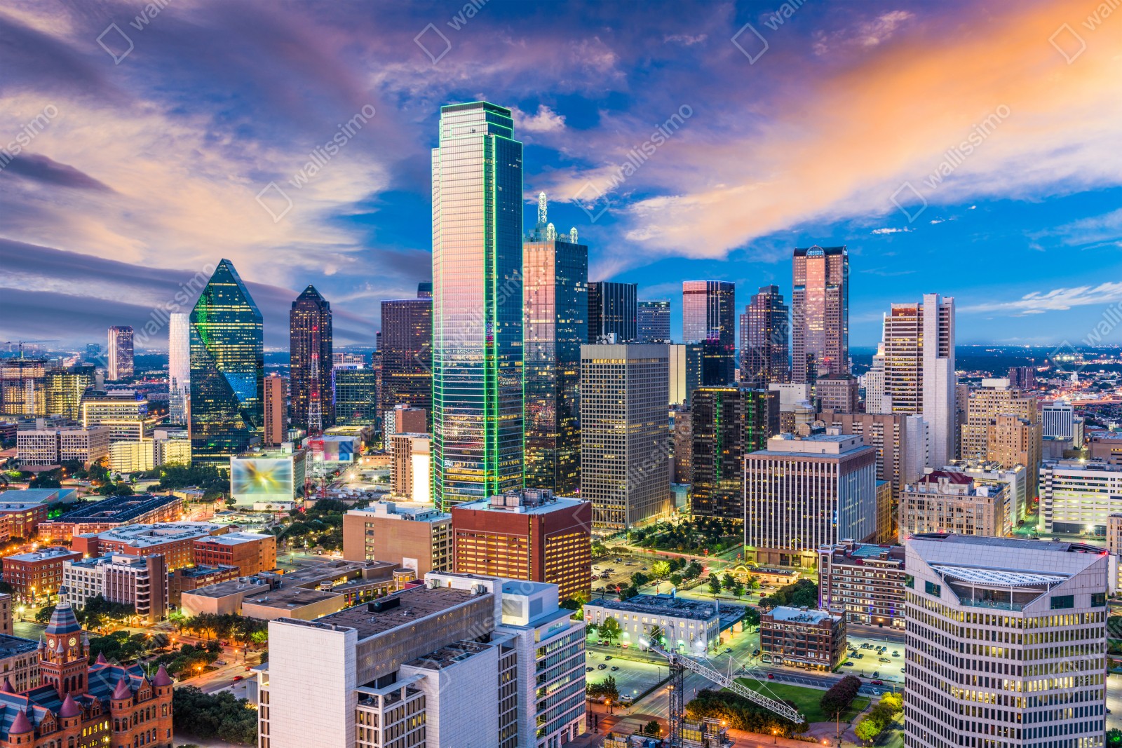 Naklejka repozycjonowalna Dallas panorama miasta o zachodzie słońca