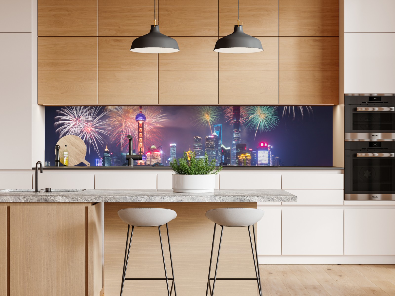 Naklejka repozycjonowalna Szanghaj panorama z fajerwerkami nad rzeką Huangpu