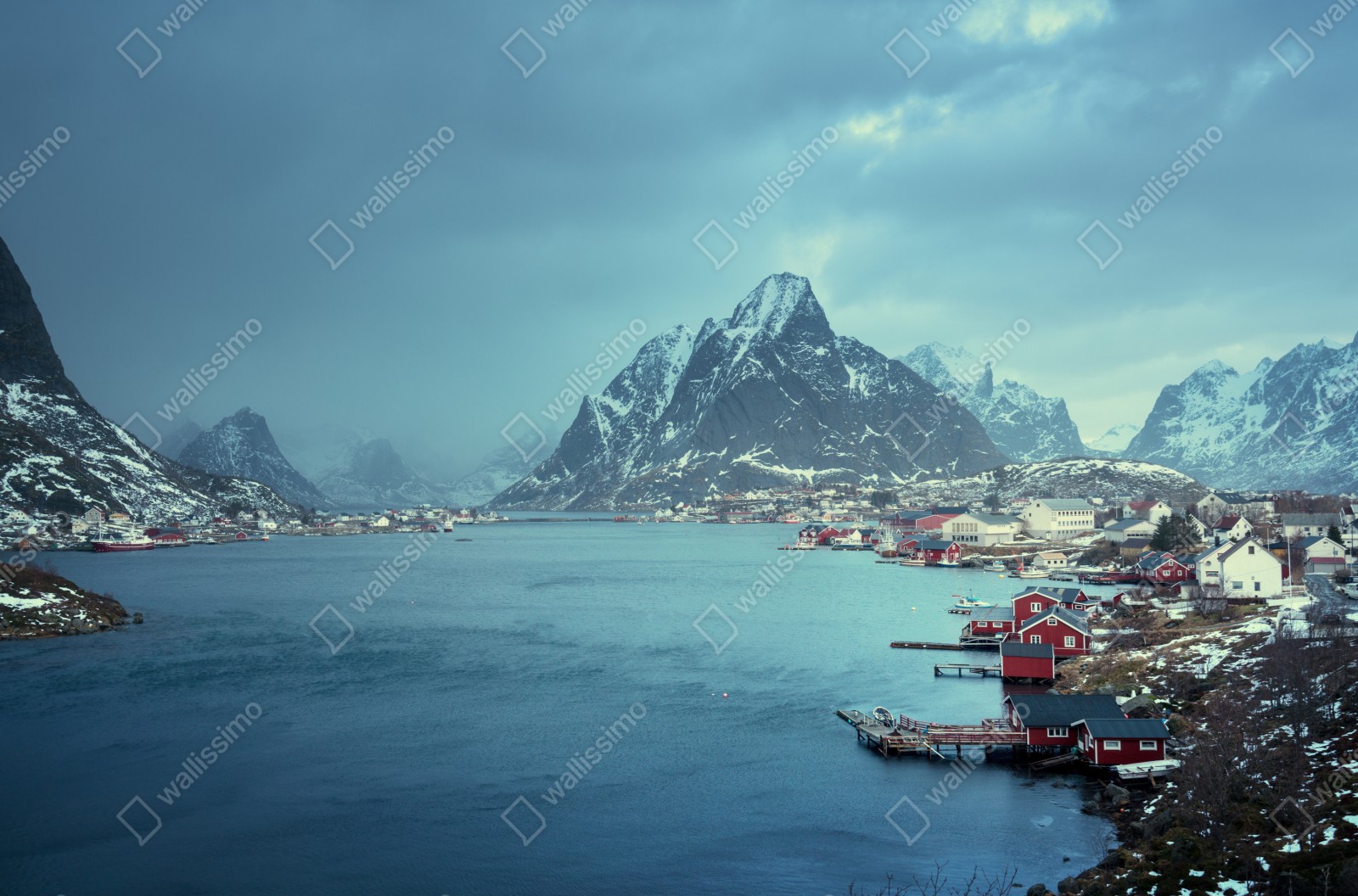 Naklejka repozycjonowalna Reine zimowy fiord w Lofotach