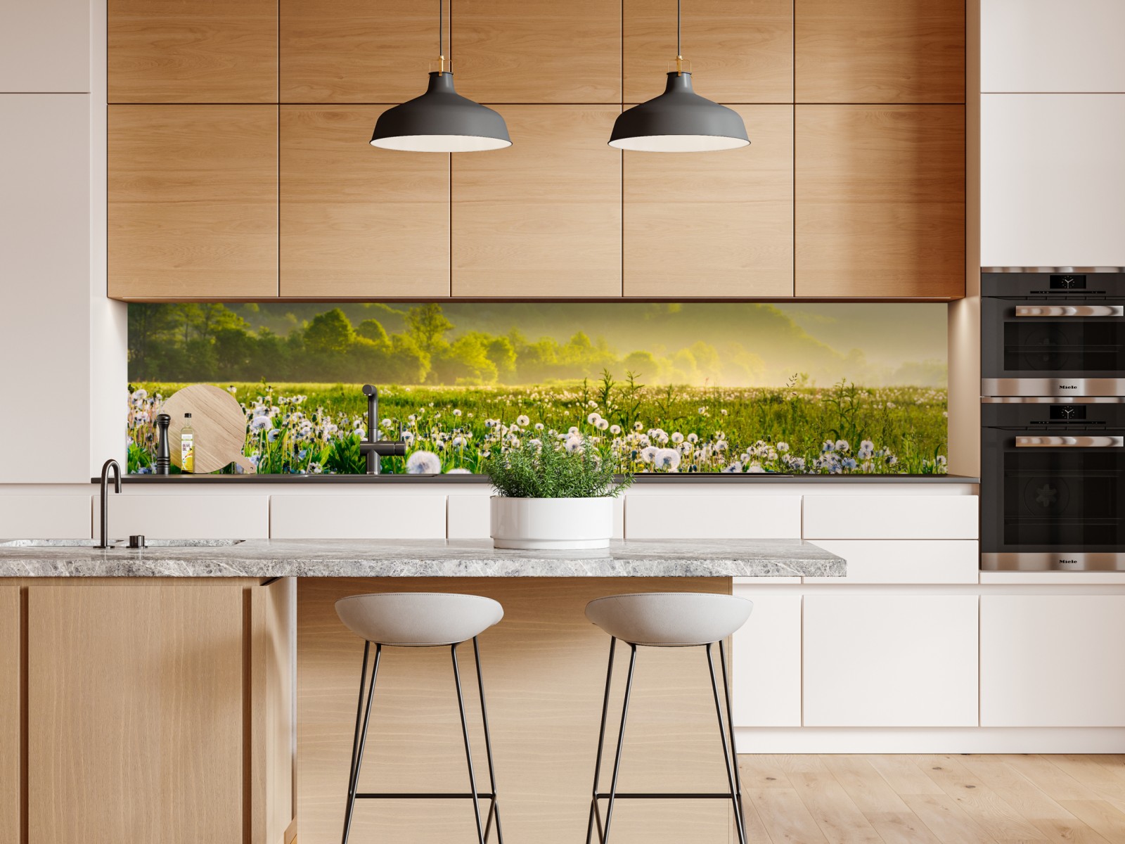Naklejka repozycjonowalna Mglista łąka mleczy o wschodzie słońca