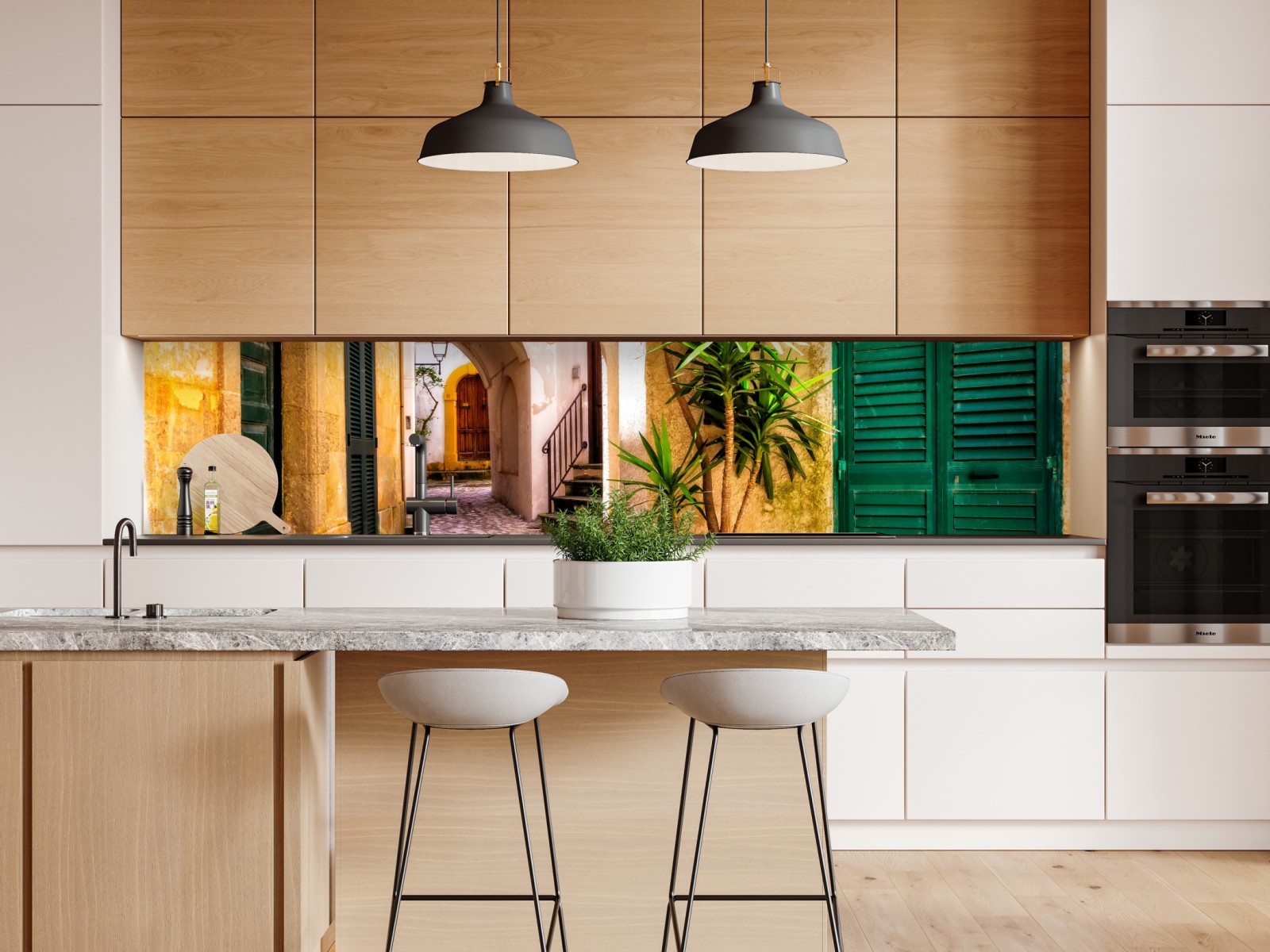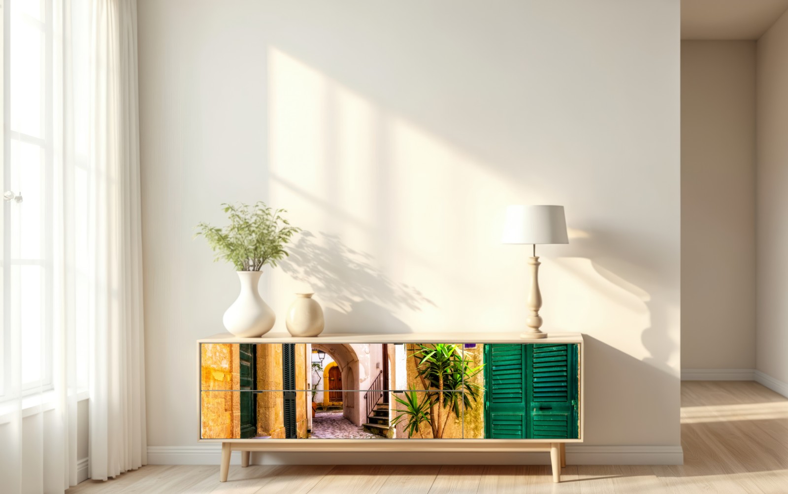 Naklejka repozycjonowalna Słoneczna śródziemnomorska uliczka z zielonymi okiennicami