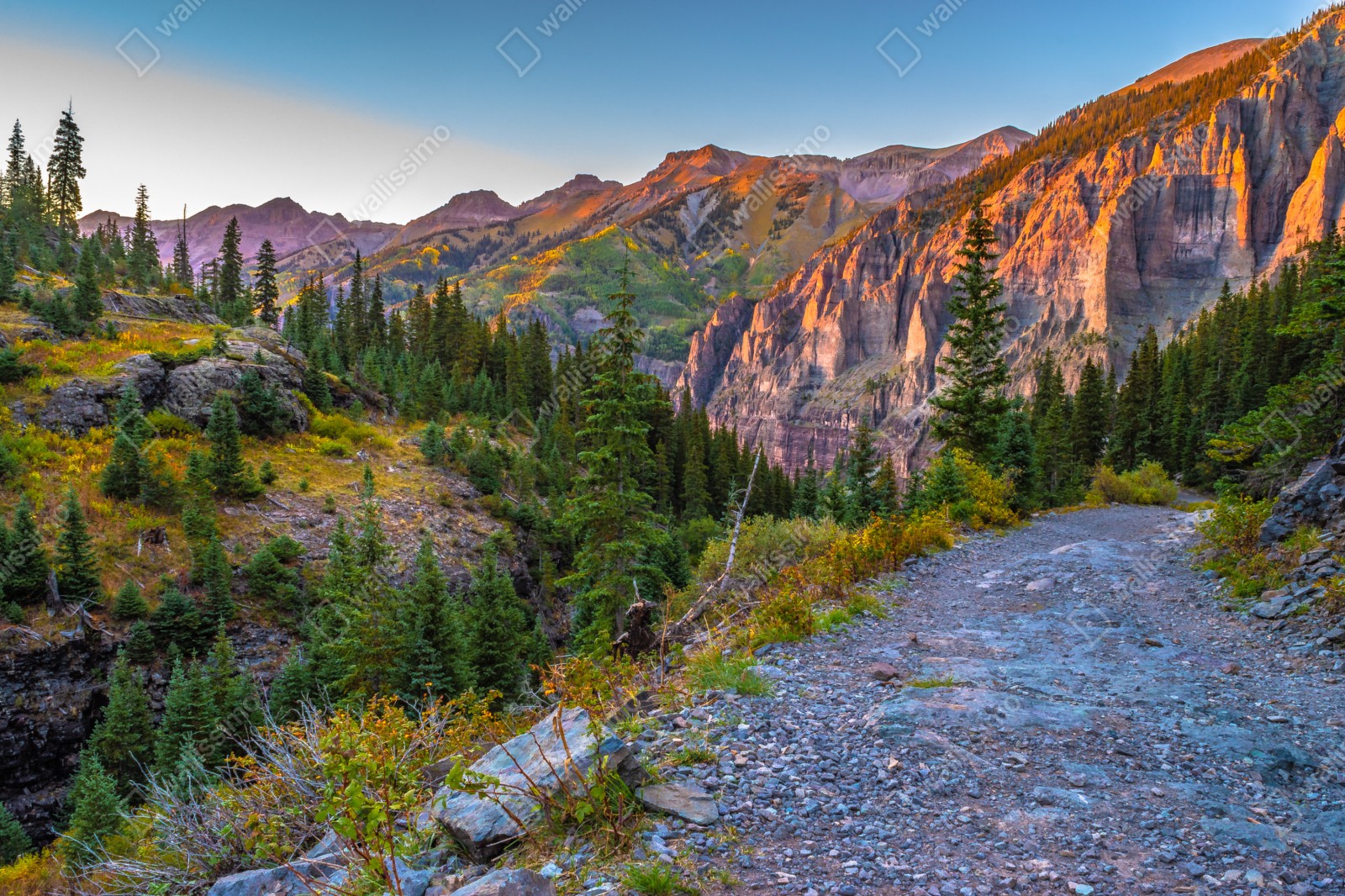 Naklejka repozycjonowalna Alpejski szlak o zachodzie słońca
