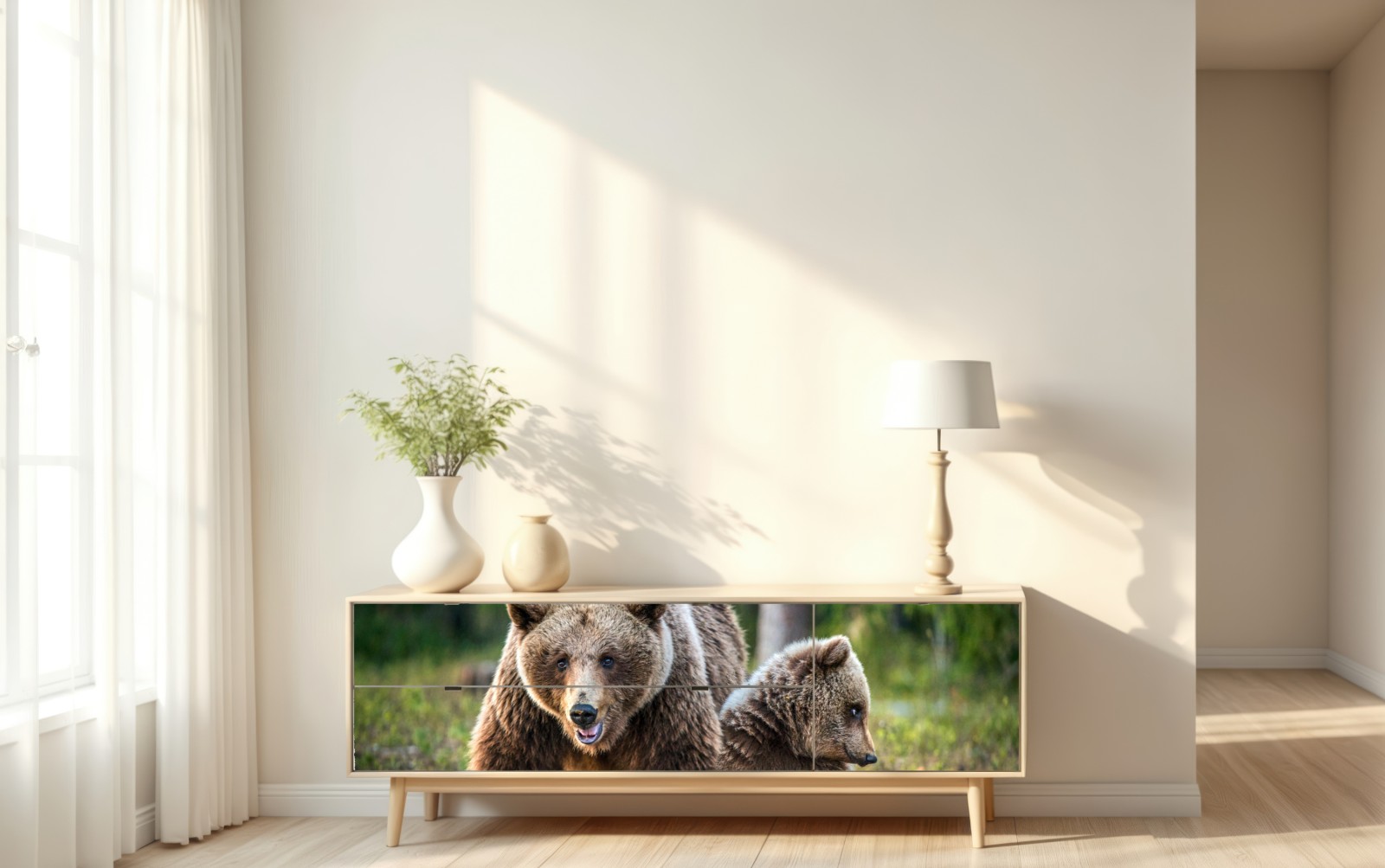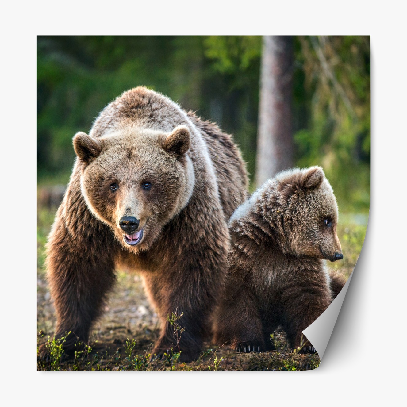Naklejka repozycjonowalna Niedźwiedź brunatny z młodym w lesie