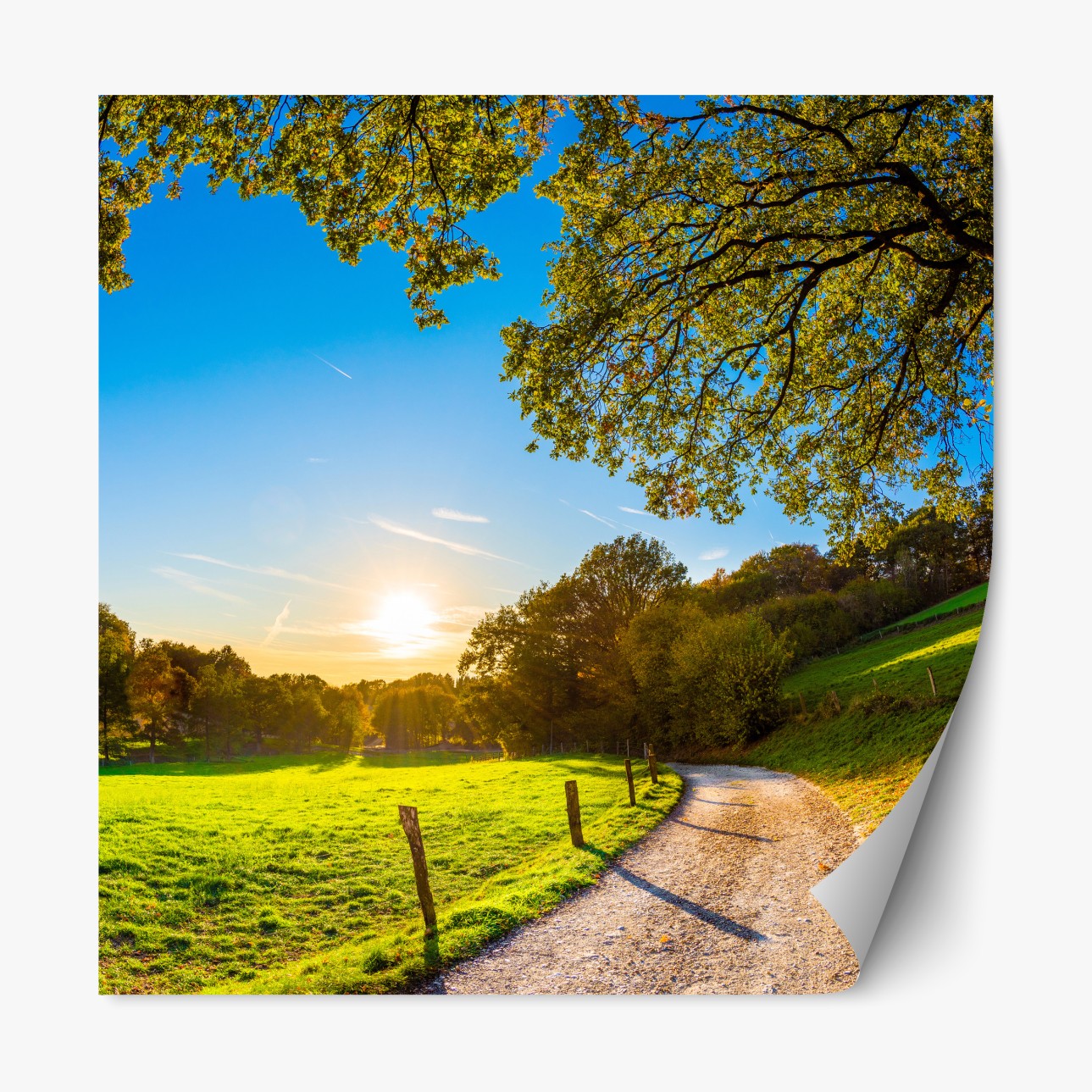 Naklejka repozycjonowalna Słoneczna łąka i wiejska droga o zachodzie słońca