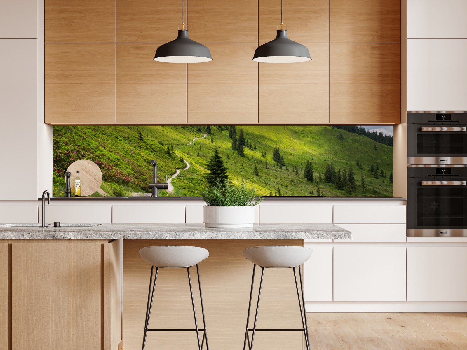 Naklejka repozycjonowalna Słoneczna górska ścieżka przez zieloną łąkę