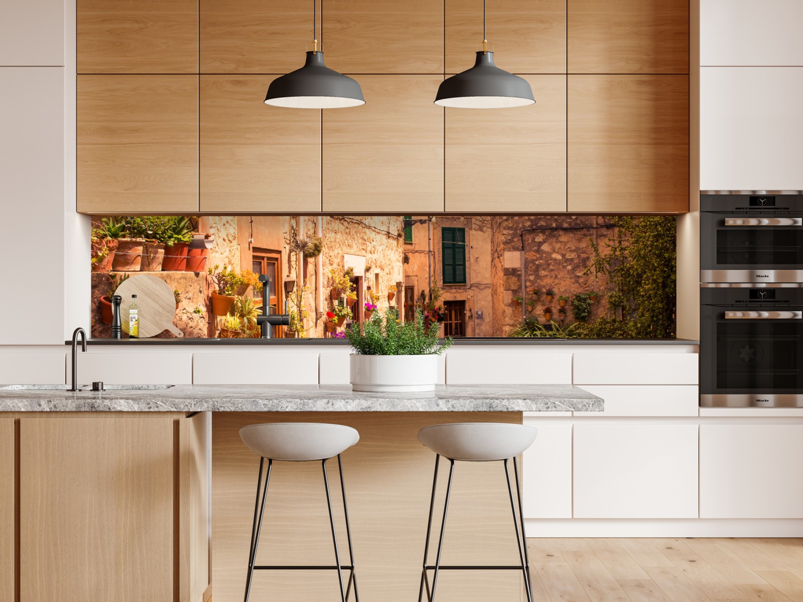 Naklejka repozycjonowalna Słoneczna uliczka śródziemnomorska z doniczkami