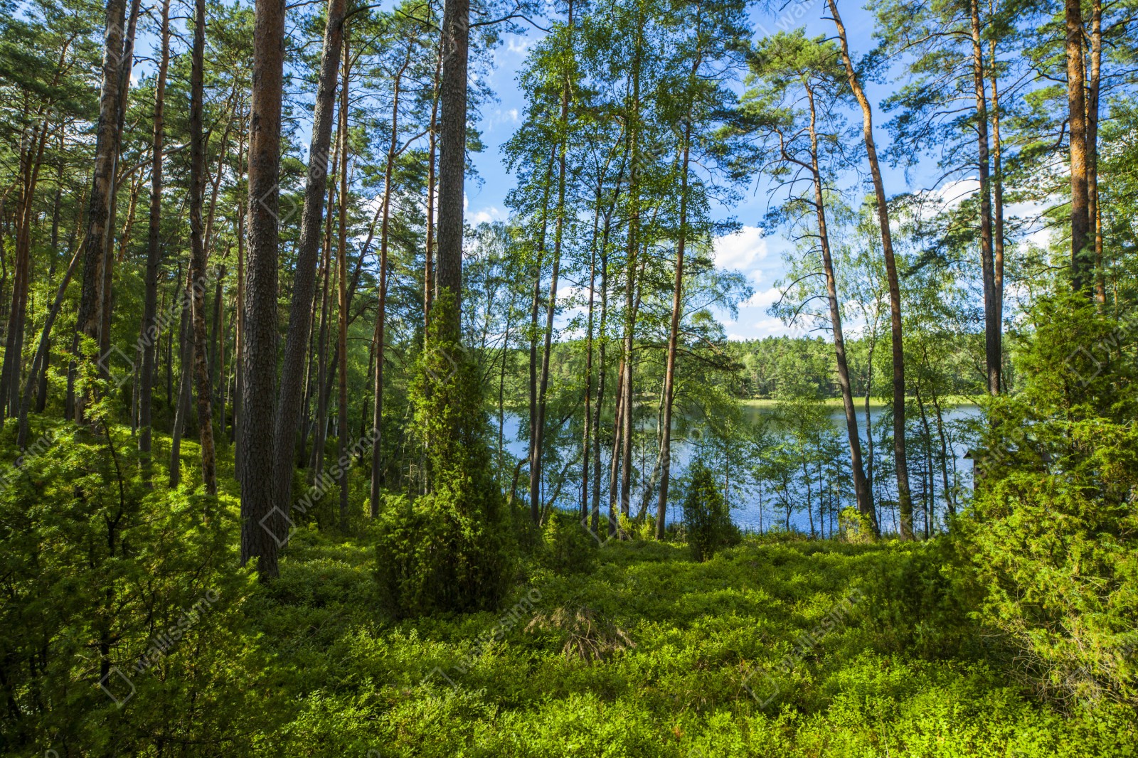 Naklejka repozycjonowalna Spokojny las sosnowy nad jeziorem