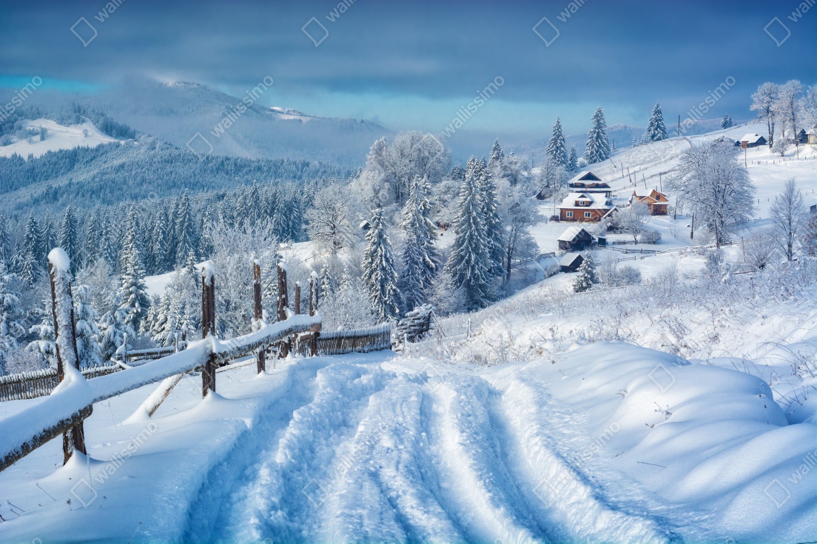 Naklejka repozycjonowalna Zimowa ścieżka do alpejskiej wioski