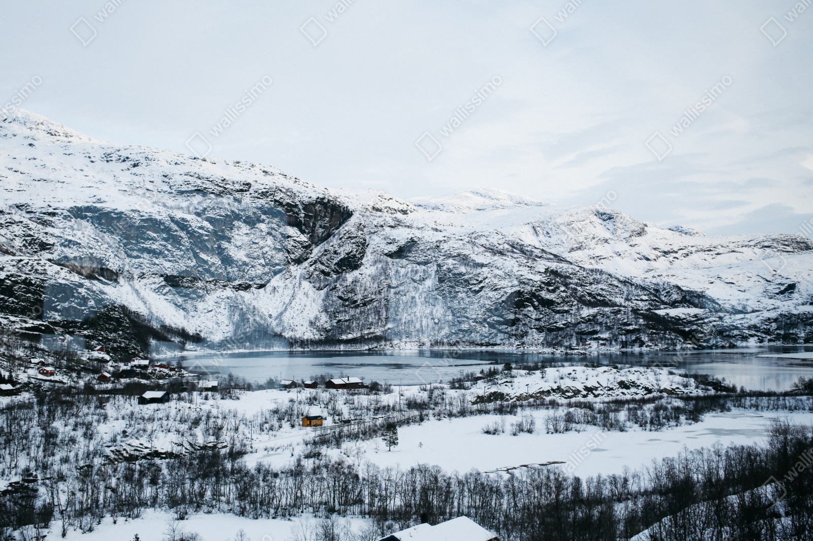 Naklejka repozycjonowalna Spokojny zimowy pejzaż górski nad zamarzniętym jeziorem