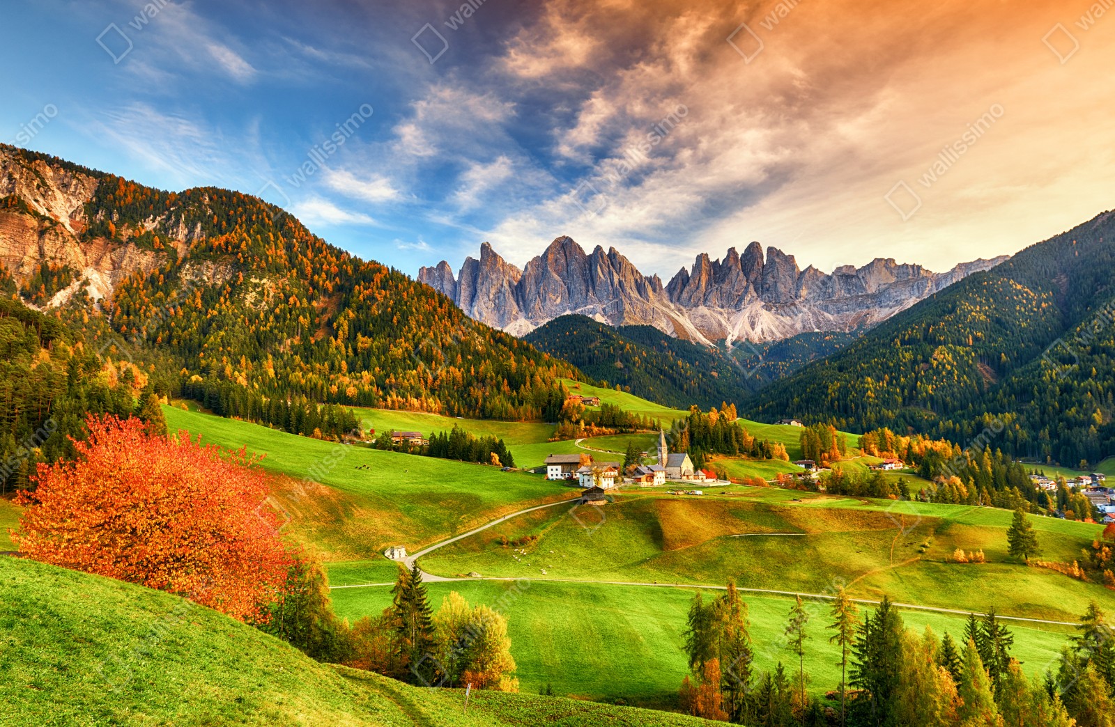 Naklejka repozycjonowalna Jesienny zachód słońca nad Santa Maddalena, Dolomity