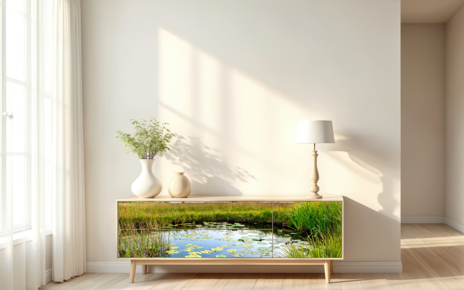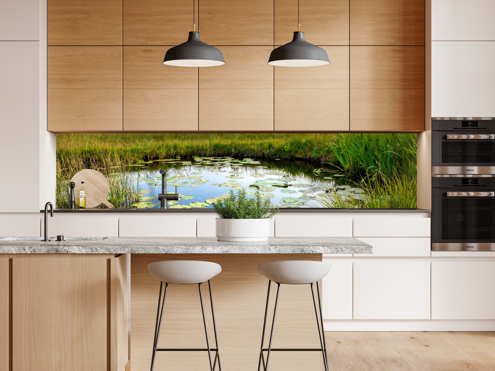 Naklejka repozycjonowalna Spokojny staw z grążelami na łące
