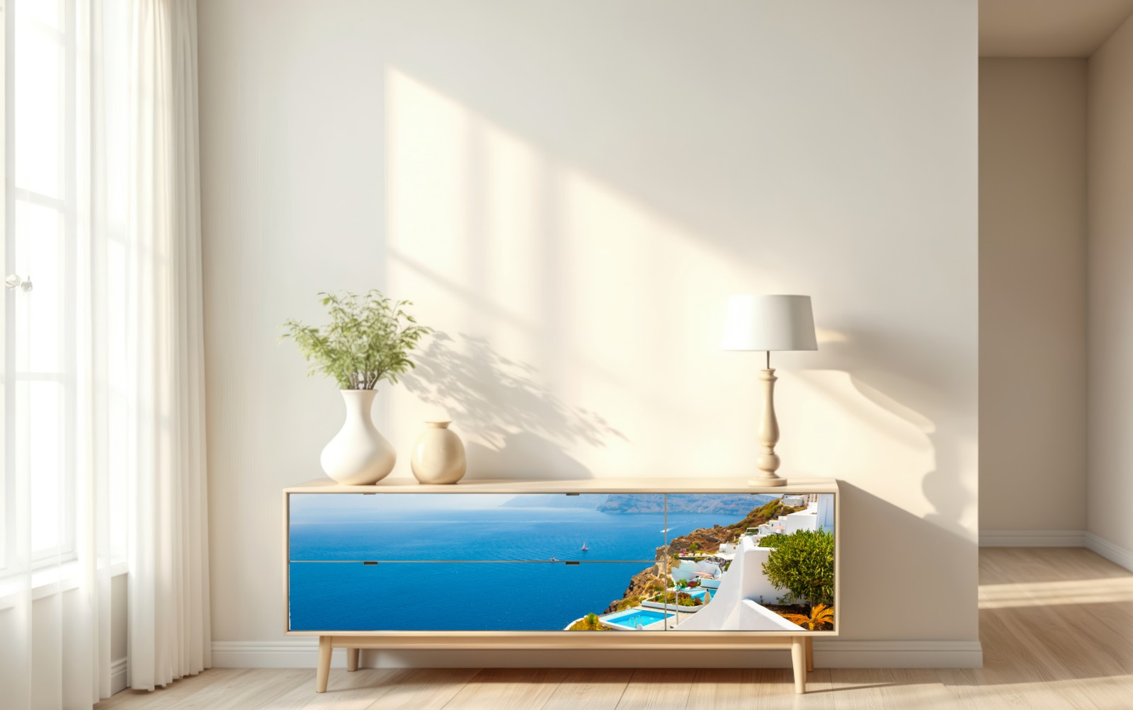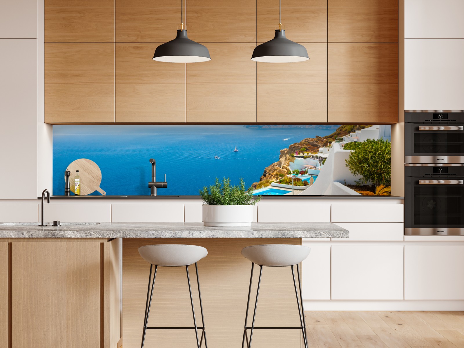 Naklejka repozycjonowalna Santorini widok na wybrzeże z białą architekturą
